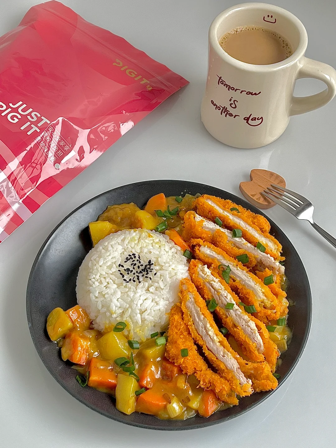 今日份早餐:咖喱猪排饭,一杯热拿铁☕️