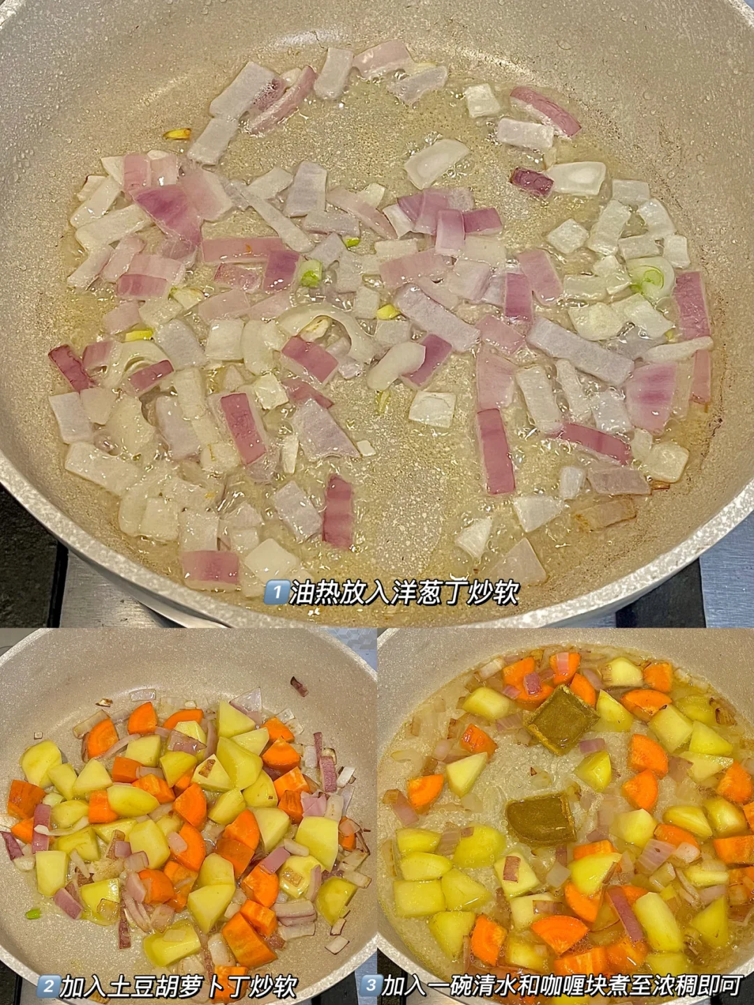 5️⃣做咖喱酱,油热放入洋葱炒软,加入土豆和胡萝卜丁翻炒均匀变软。