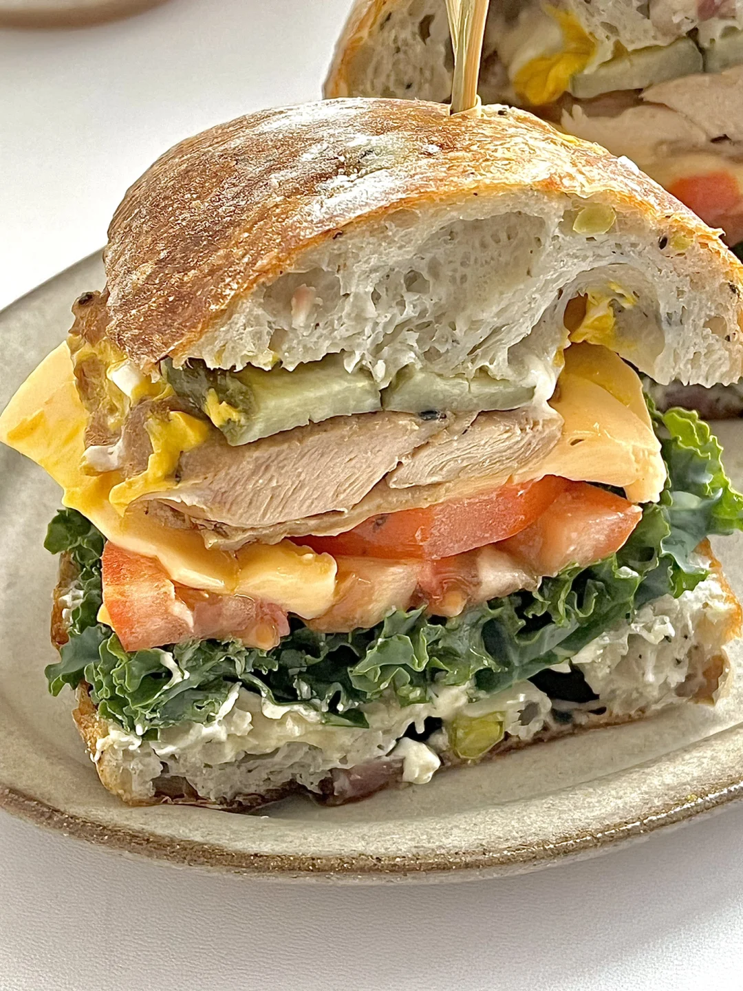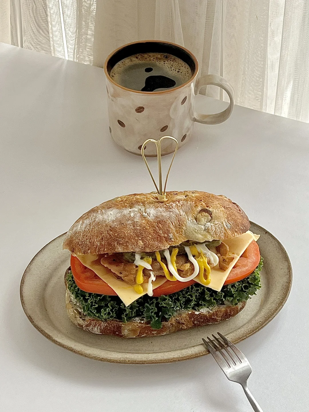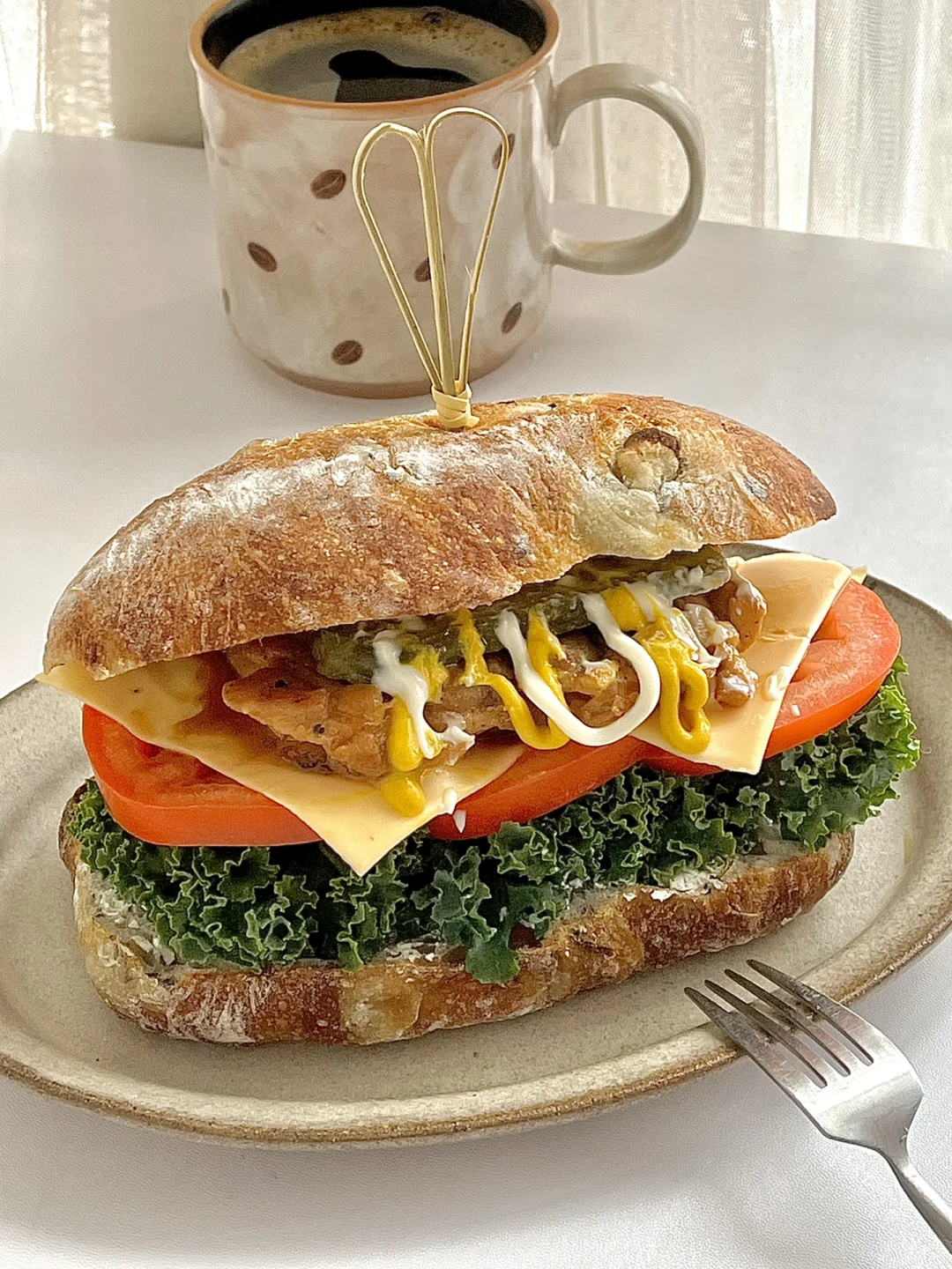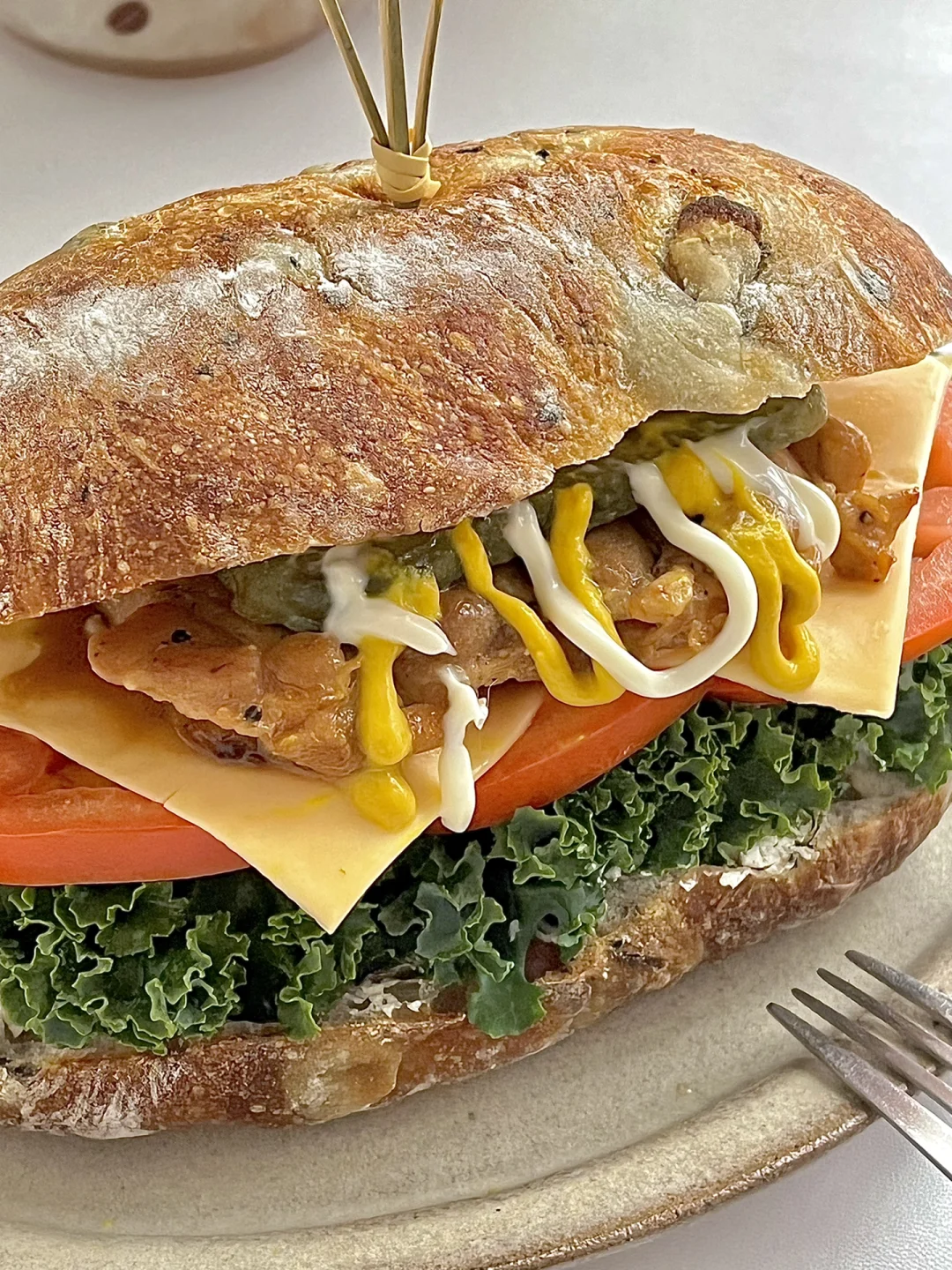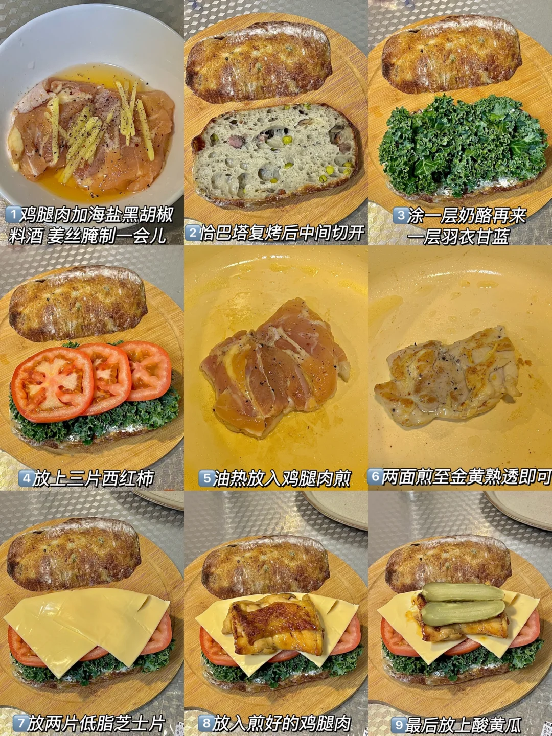一人食吃什么 今日份早餐分享: 恰巴塔鸡排芝士三明治🥪 一杯美式☕️ . 1️⃣去骨鸡腿肉放海盐黑胡椒,姜丝料酒腌制(😌提前一晚腌制比较入味) 2️⃣恰巴塔切开复烤。底层放羽衣甘蓝。 3️⃣放入三片西红柿🍅 4️⃣鸡腿肉放入锅中两面煎熟。 5️⃣西红柿上放两片芝士,把煎好的鸡腿肉放在上面。 6️⃣再来点酸黄瓜增加口感,盖上另一片恰巴塔。 . 吃一半就好饱的三明治😋今天的料放的很丰富 新周快乐呀!