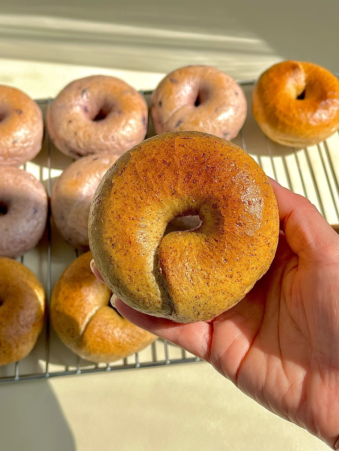 放冷的贝果可以装进保鲜袋冷冻起来,吃的时候喷水里面烤箱烤,口感跟刚烤一样呢。