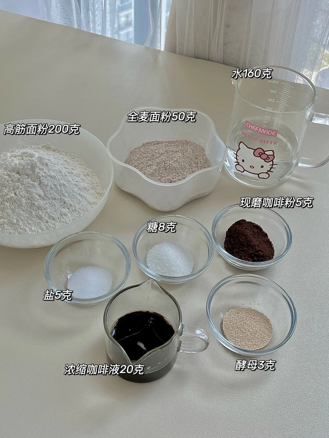 🥯食材:高筋面粉200克,全麦面粉50克,盐5克,糖8克,现磨咖啡粉5克,酵母3克,浓缩咖啡液20克,水160克。(煮贝果糖水,500毫升清水25克糖)