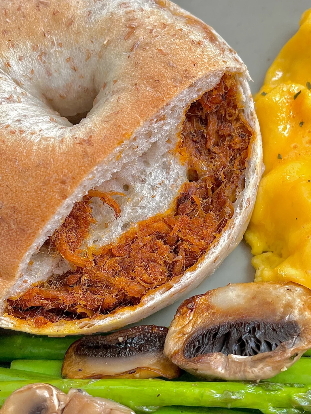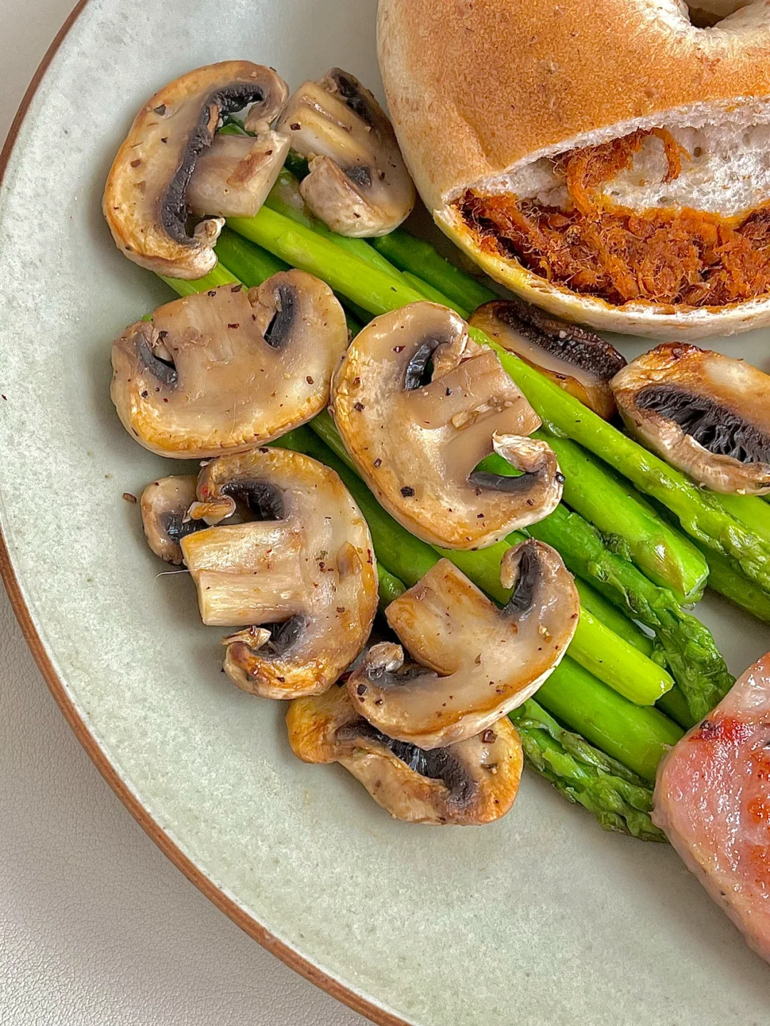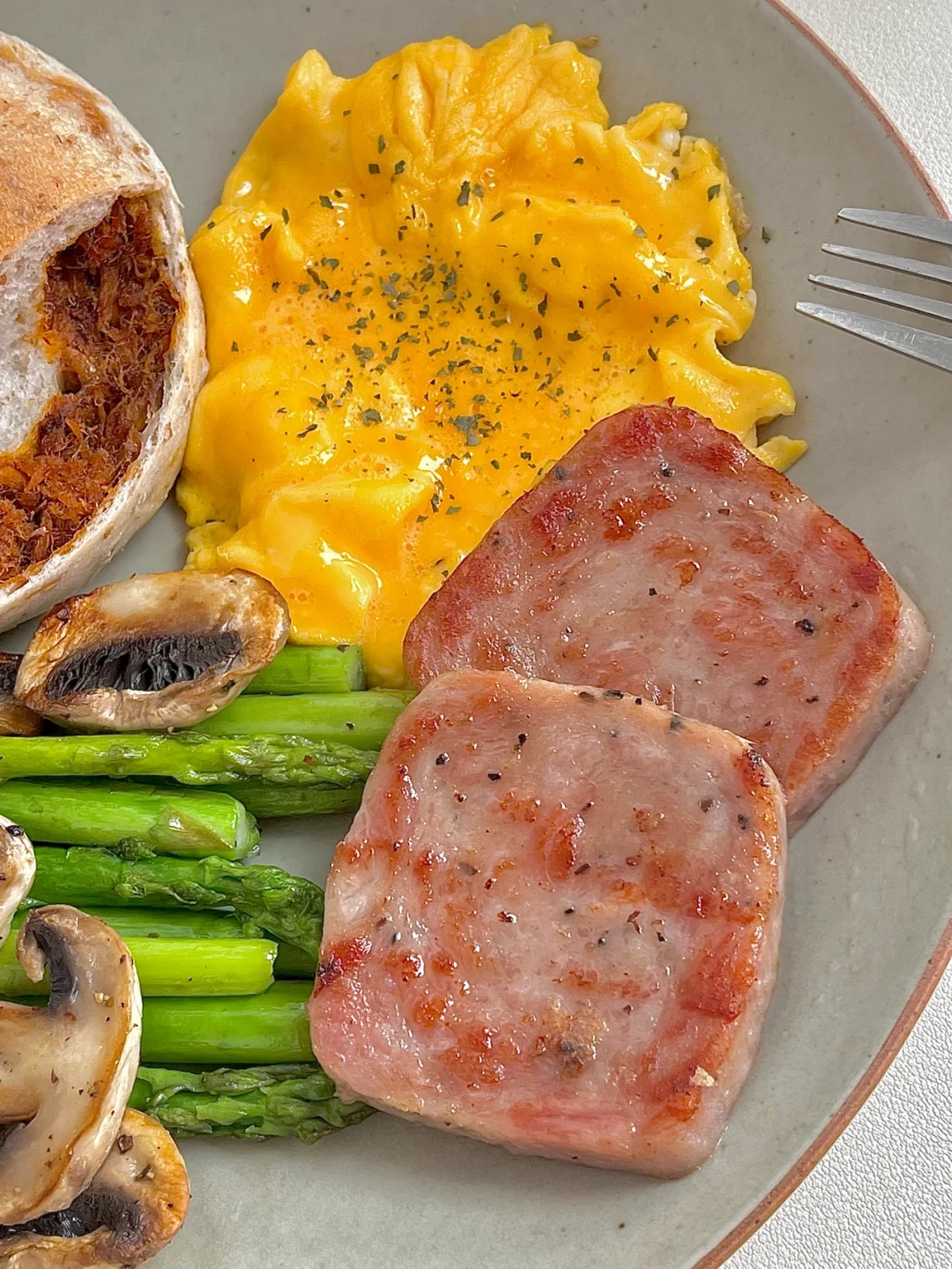 今日早餐分享:辣肉松芝士贝果|牛奶滑蛋|煎午餐肉|煎芦笋 口蘑|一杯冰燕麦拿铁☕️ . 特别喜欢辣味肉松和芝士的融合,微辣口味,越嚼越香。这个贝果吃完就贼饱,太扎实了。 . 祝大家新周快乐呀!