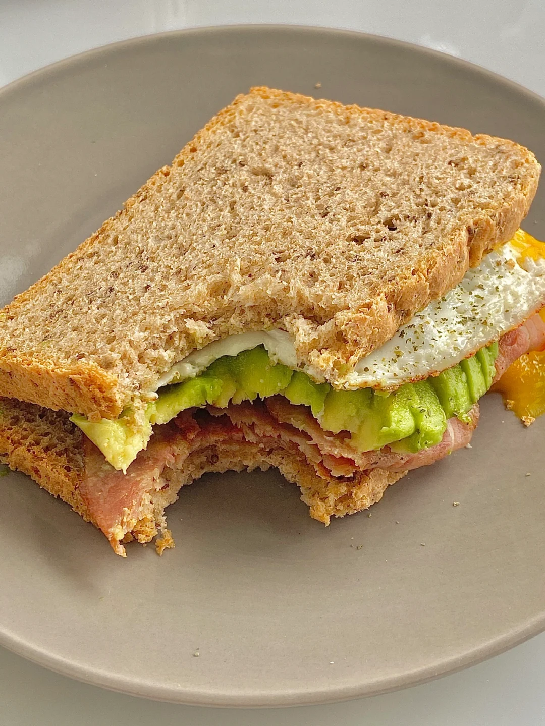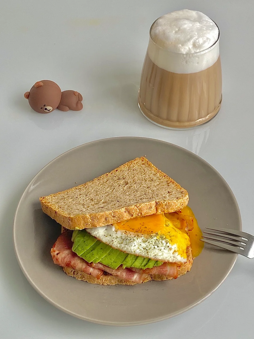 今日份早餐:全麦三明治🥪,一杯热拿铁☕️ . 周一如期而至,又是忙乱的一早上,刚有时间坐下了。 早餐收拾冰箱库存(剩下的半个牛油果,三片培根外加一个鸡蛋)拼凑起来的快手三明治🥪。 . 新周快乐,我还有点没睡醒😒