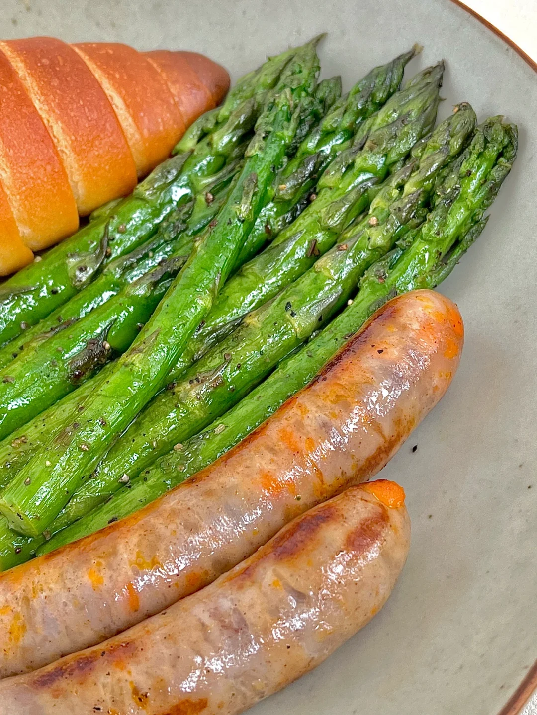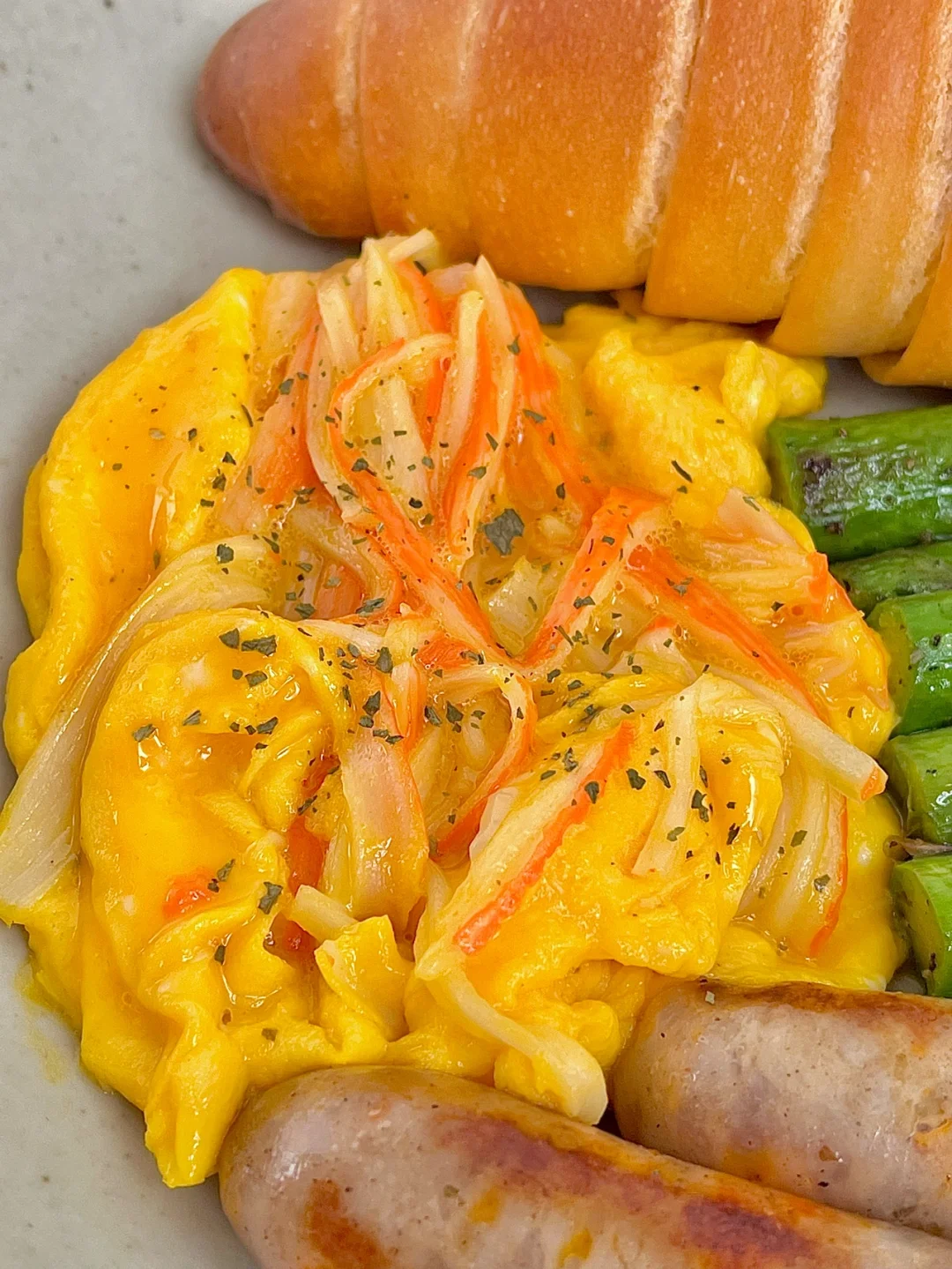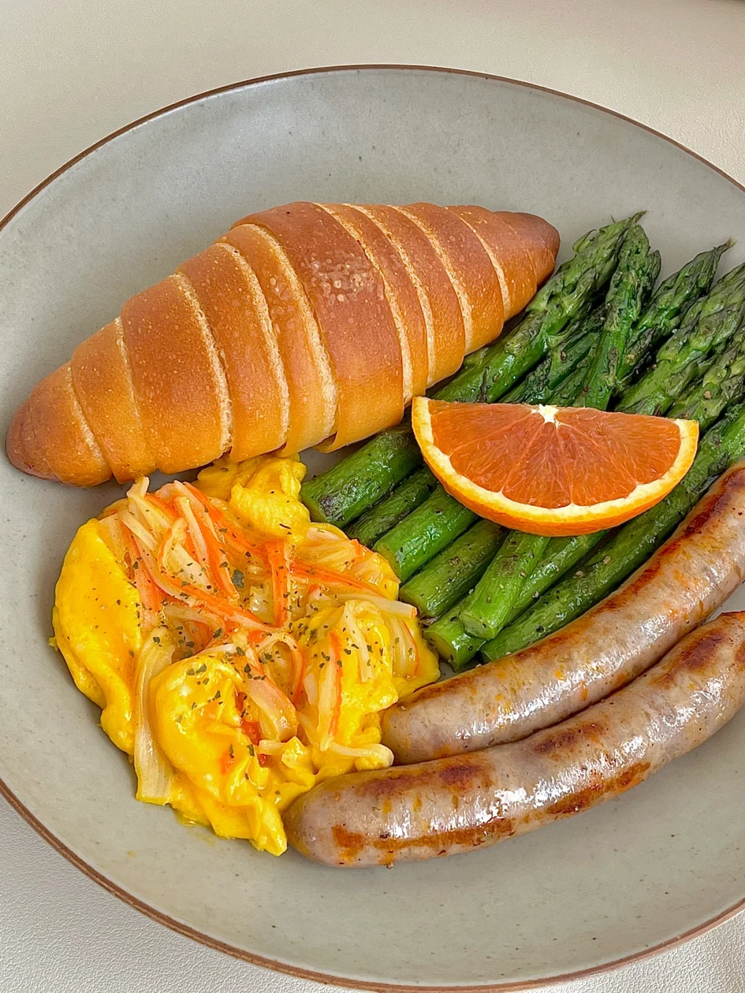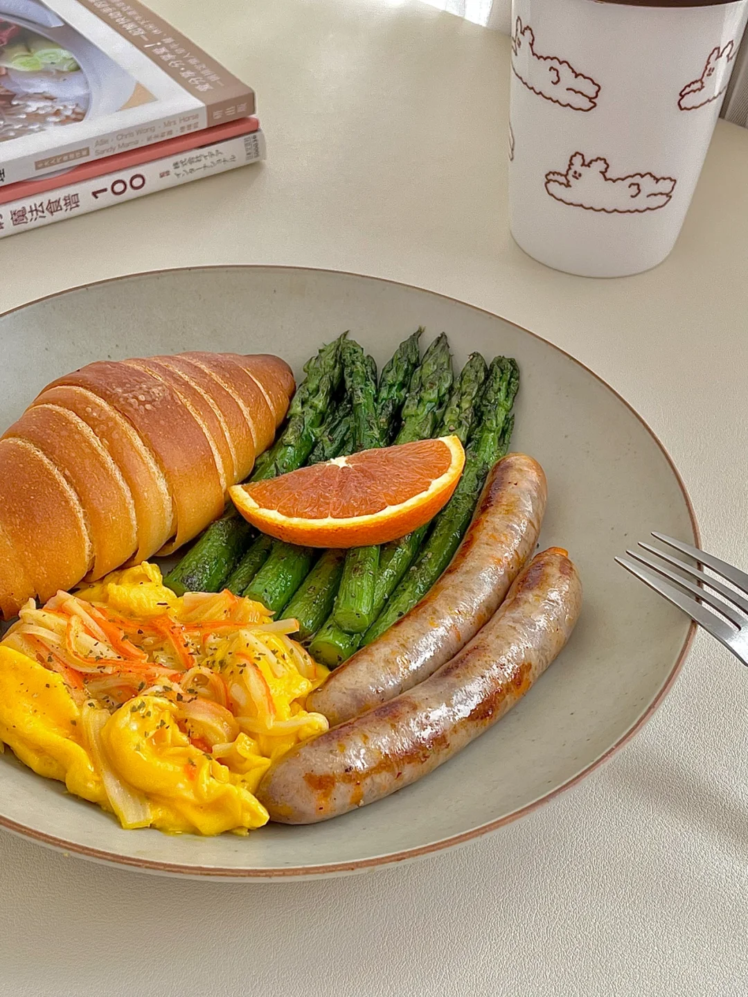 休息日休息的好,早睡早起,所以工作日的早上就能按时起床没有拖拉,给自己来一份元气满满的早餐! . 芦笋用橄榄油煎的,没放多少怎么油汪汪的 今天的蟹柳滑蛋真的好嫩好好吃 工作日早餐吃两根香肠应该不过分吧😂 盐卷也是深得我心,口感棒棒哒 . 祝宝子们新的工作学习日快乐呀