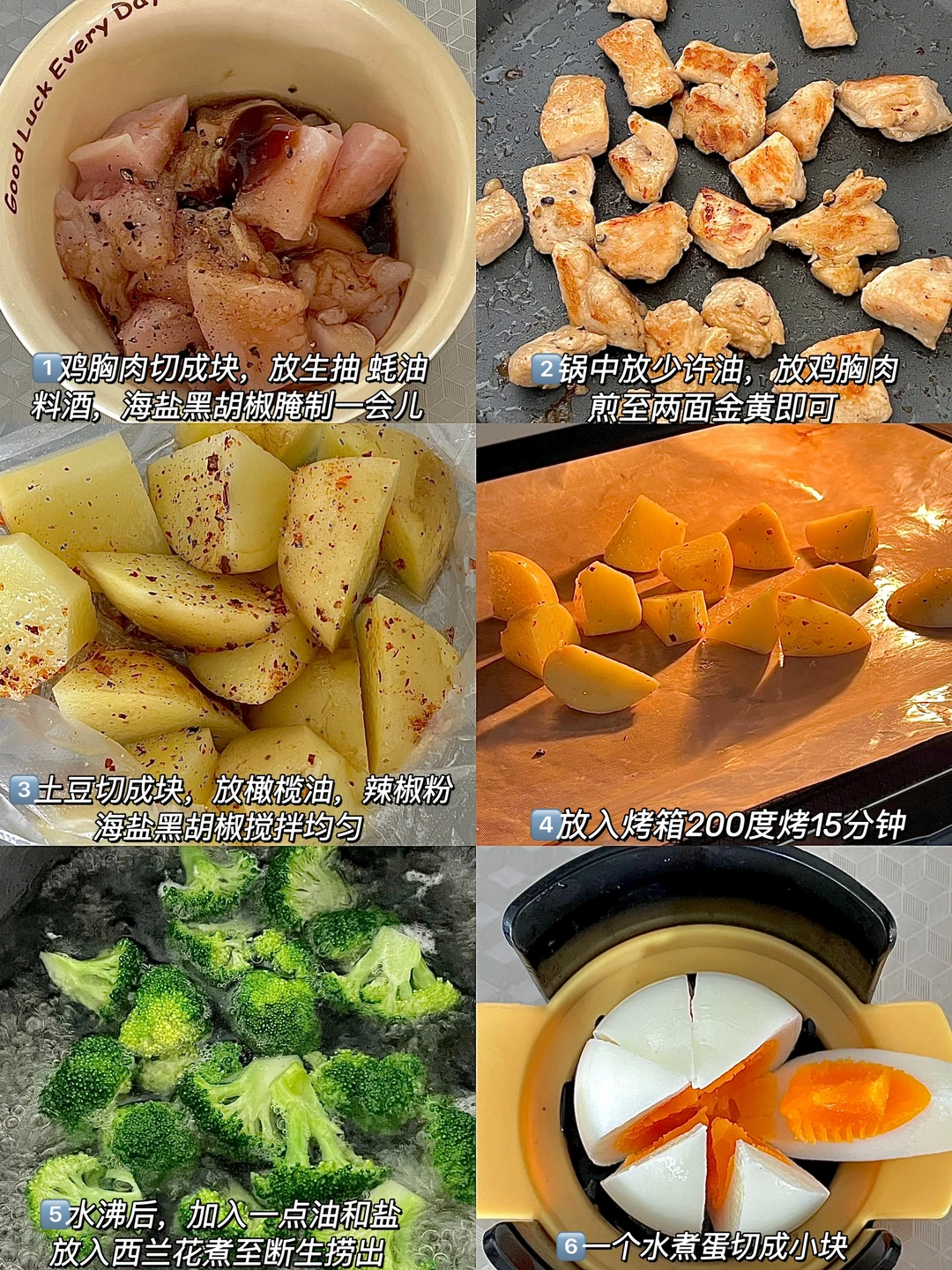 热气腾腾的三餐 今日份早餐分享: 鸡胸肉土豆鸡蛋沙拉🥗 一杯冰美式☕️ . 1️⃣半块鸡胸肉切成小块。放料酒,生抽,蚝油,海盐黑胡椒腌制一会儿。 2️⃣锅中放少许油,放鸡胸肉煎至两面金黄即可。 3️⃣一个土豆切成小块,放橄榄油,辣椒粉,海盐黑胡椒搅拌均匀。 4️⃣烤箱预热好,200度烤15分钟。 5️⃣水开后,加入几滴油,一点盐,放入西兰花焯水至断生。 6️⃣一个水煮蛋切成小块。把食材都摆在碗中即可。 . 这几天天气热,还是吃点清爽的沙拉舒服😌