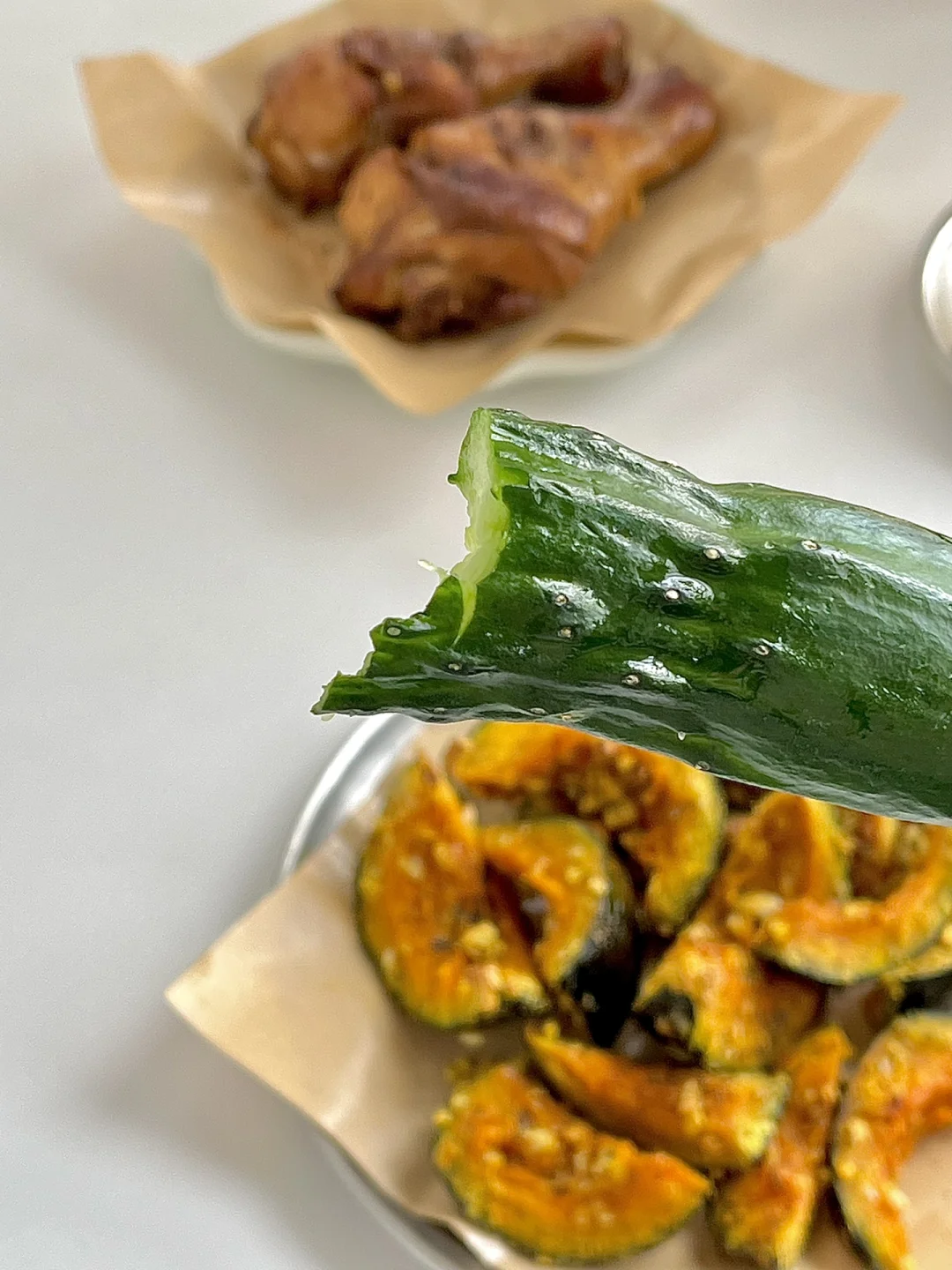 今天的鸡腿烤的也很嫩呢,缺点维生素再搭配一根黄瓜吃,哈哈😆