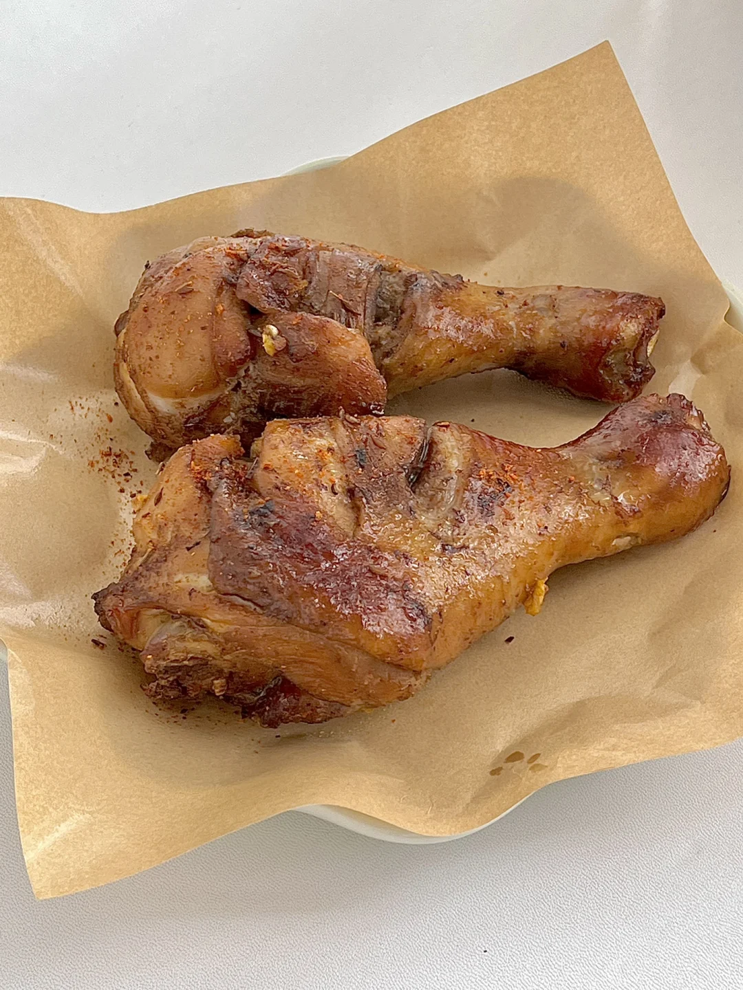 2️⃣鸡腿泡出血水,吸干水分。放料酒,生抽,蚝油,胡椒粉,盐,辣椒粉,孜然粉,腌制半小时以上。