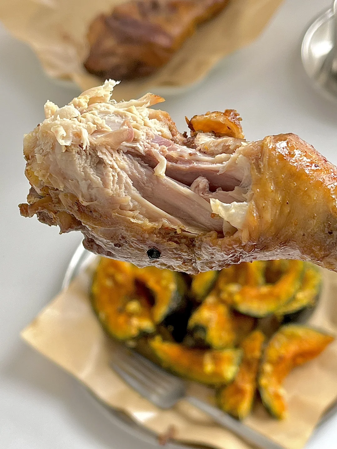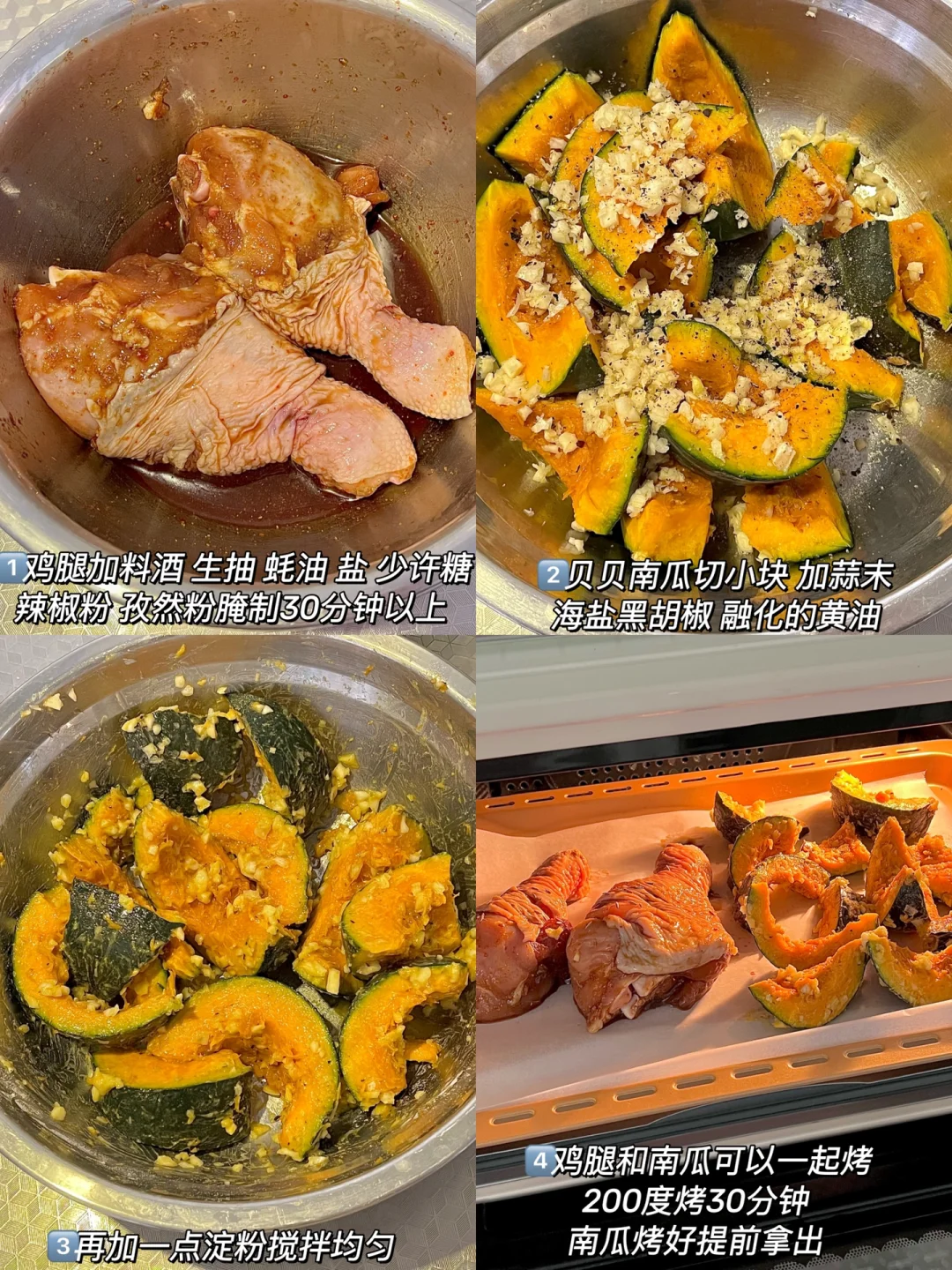 3️⃣南瓜和鸡腿可以同时烤。中间可以隔开些,防止鸡腿烤的过程中出水。200度烤30分钟,南瓜烤20分钟左右就能烤好提前拿出即可。
