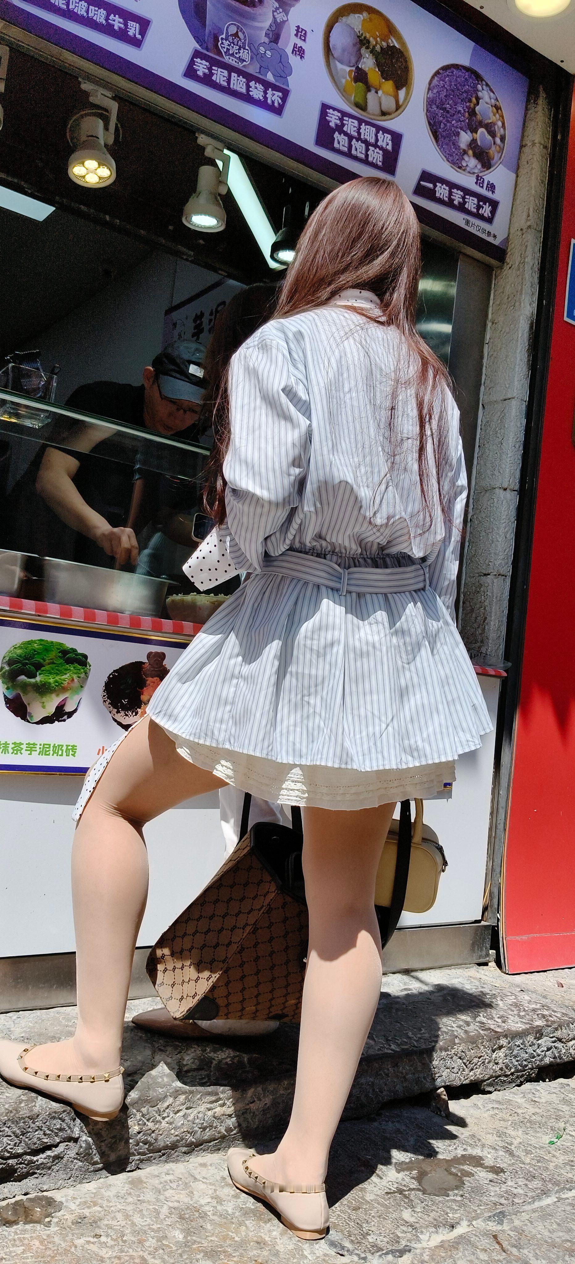 蓝白条纹衬衫裙搭奶杏小包+铆钉鞋,清新又带点甜酷