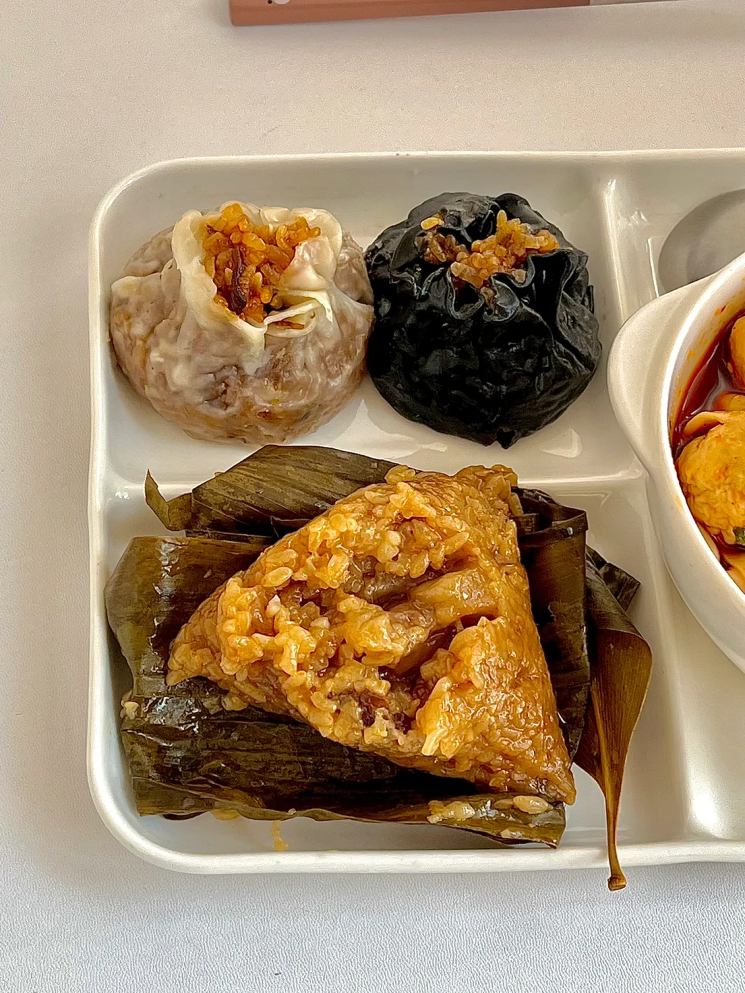 今日份早餐分享: 麻辣馄饨 肉粽子 烧麦 还喝了一杯美式☕️ . 今天的早餐真的是碳水配碳水,糯唧唧搭配麻辣馄饨 你们猜我吃完了吗? 幸福的碳水早餐迎接周五到来! 早上阴天🌥️,图是真难修,就凑合看吧😂