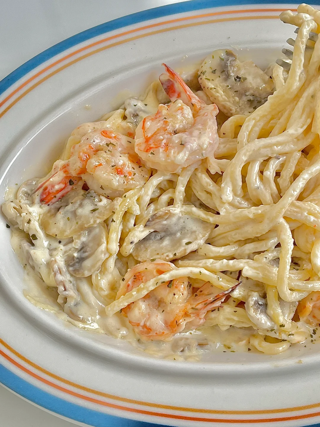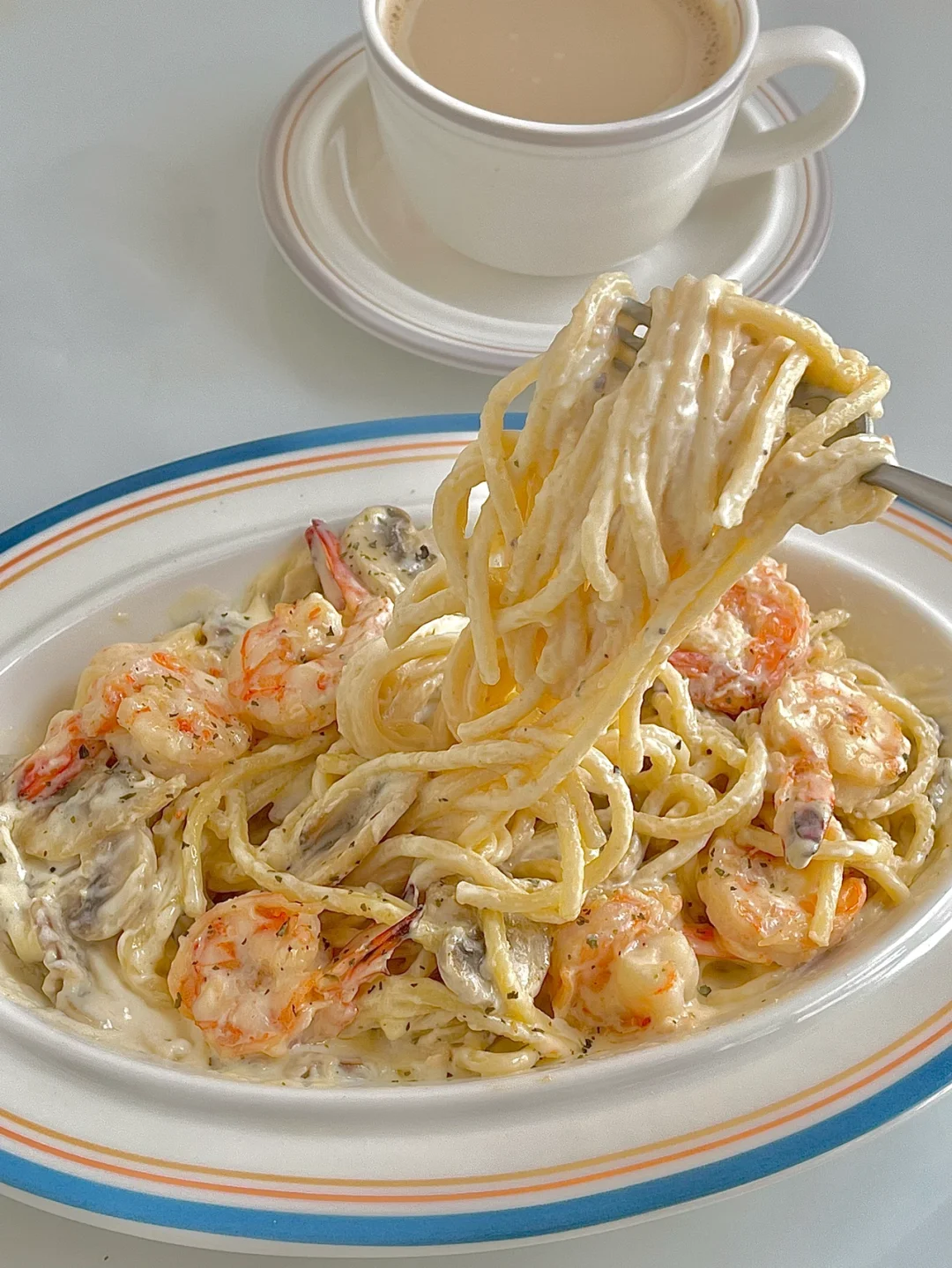 今日份早餐:奶油虾仁蘑菇意面,一杯热拿铁。