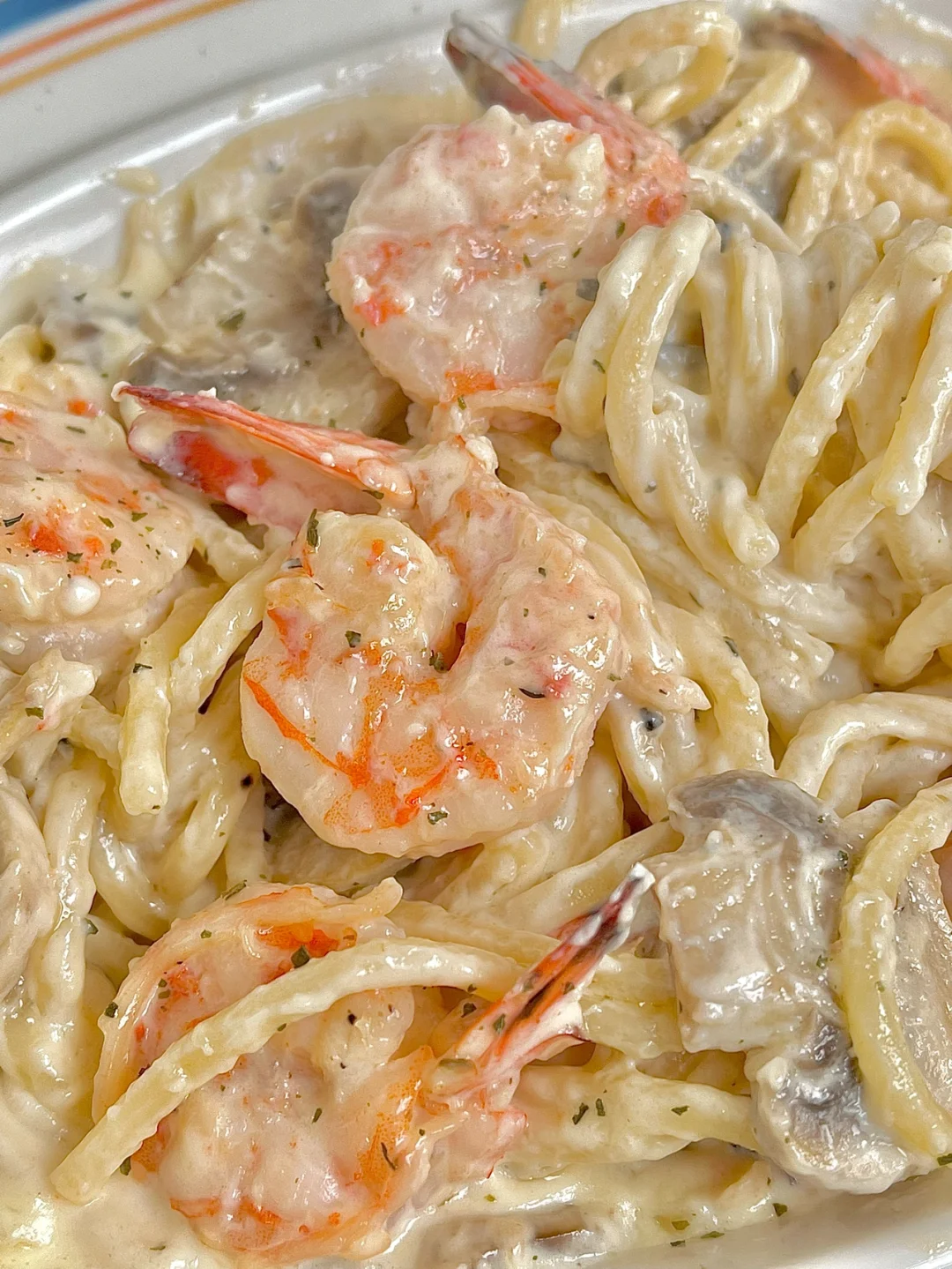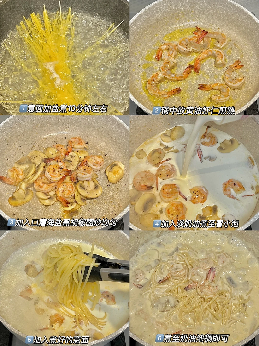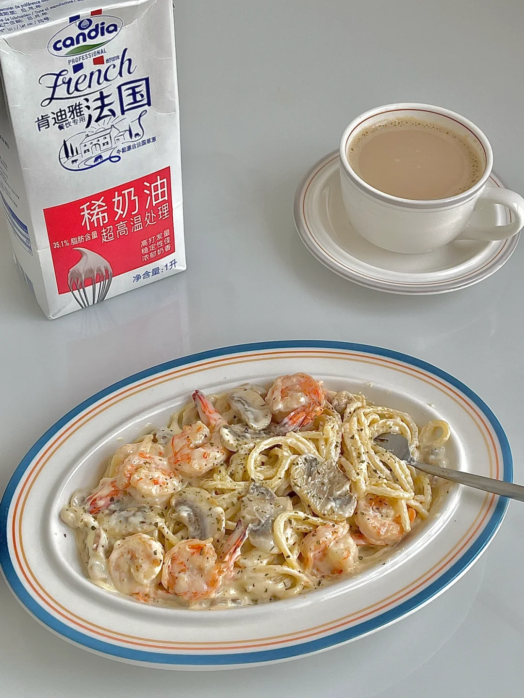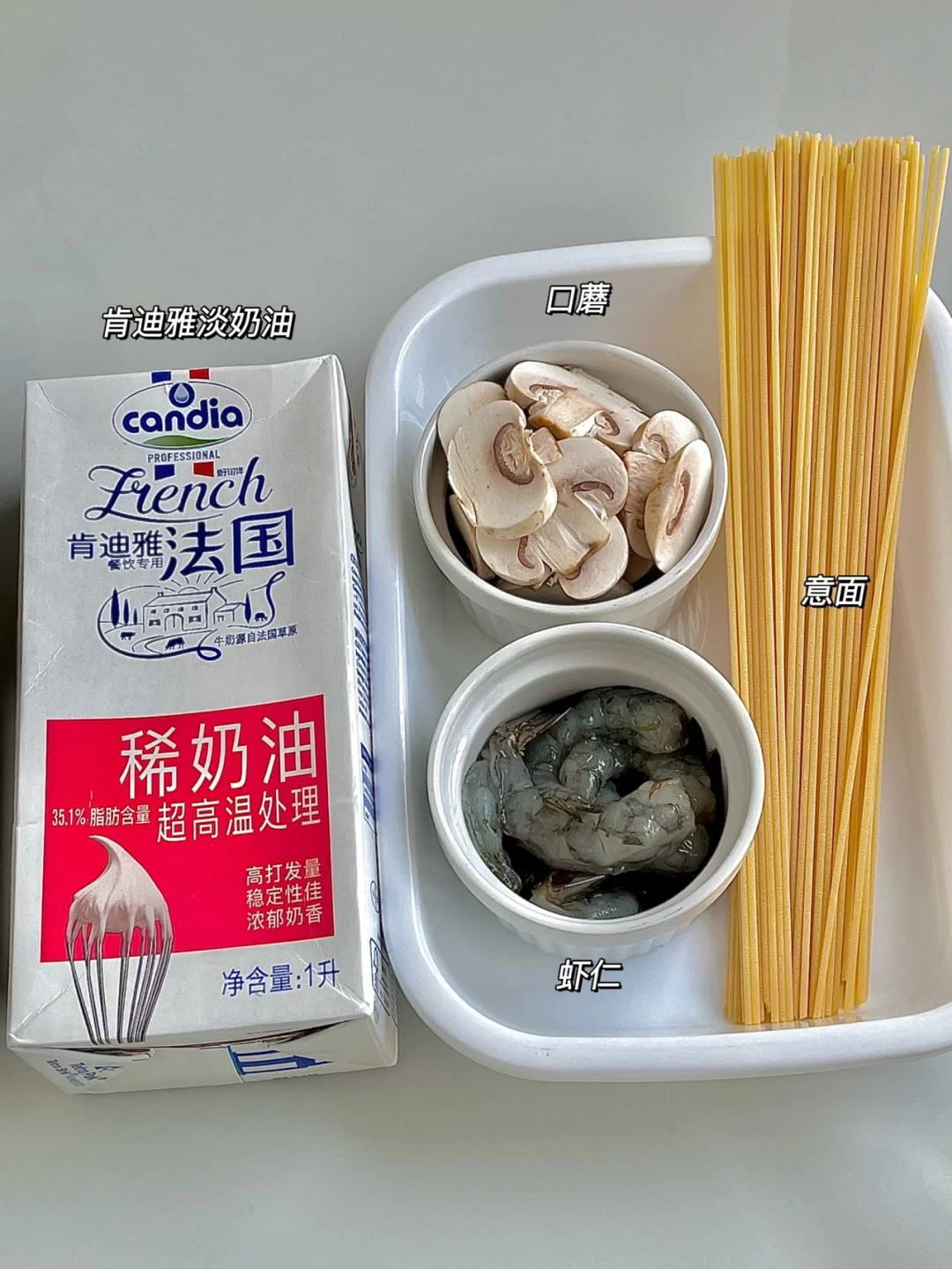 🍝配料:淡奶油250毫升,口蘑四个,虾仁8个,意面50克。