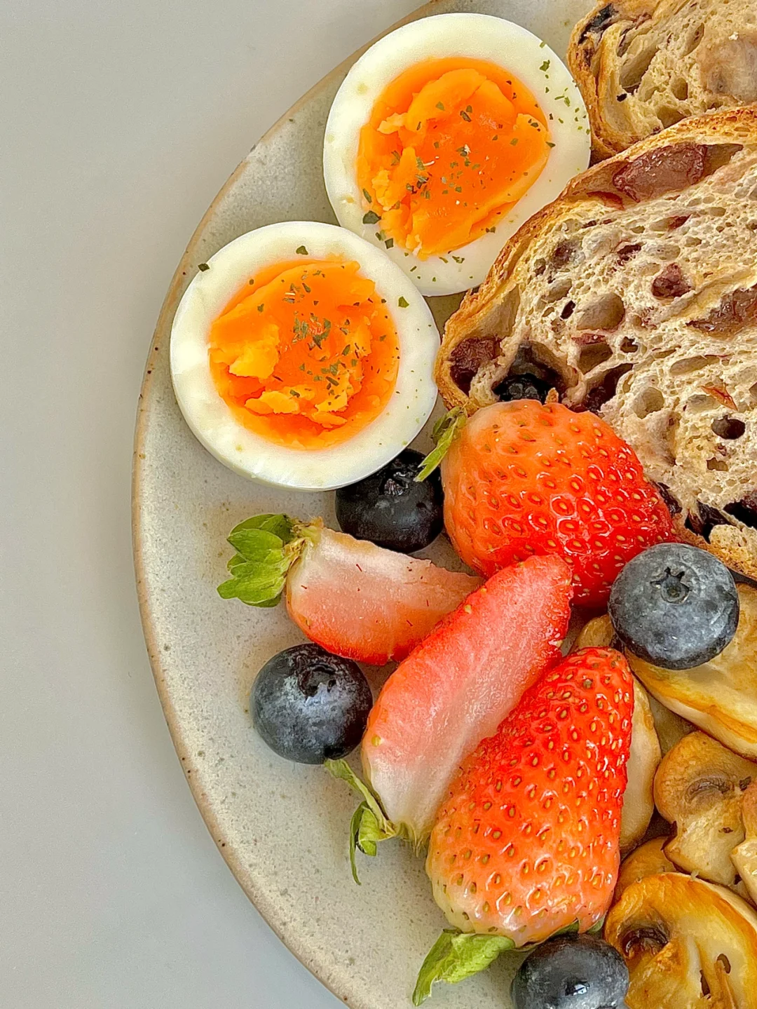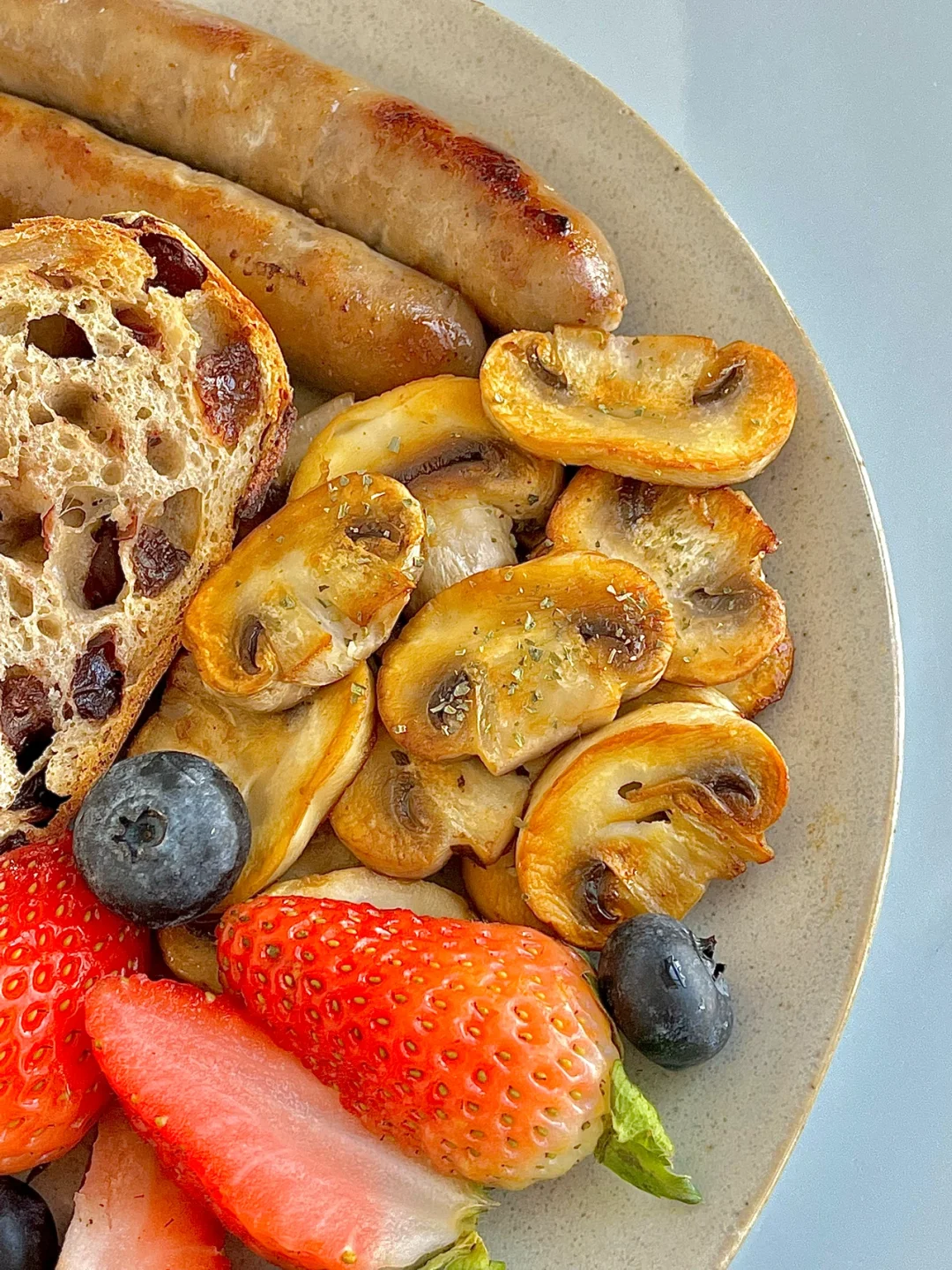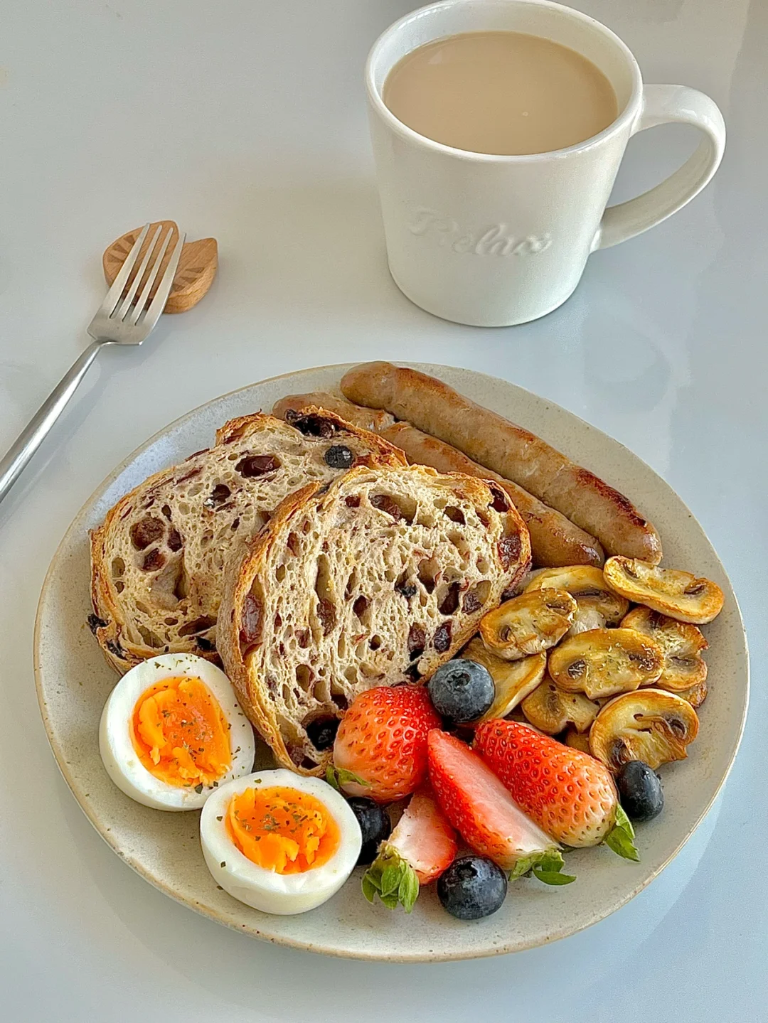 今日份早餐:蔓越莓提子欧包,水煮蛋,煎香肠,煎口蘑,草莓,蓝莓,一杯热拿铁☕️ . 每次拼凑的早餐盘我都想摆的满满的不留一点缝隙😂。草莓🍓季到了,又可以美美的摆盘了,现在吃还不是很好吃,有点硬有点酸。 . 每天的坚持,不是为了感动谁,也不是为了证明给谁看,而是我知道,一路奔跑,总比原地踏步更好,要加油鸭!