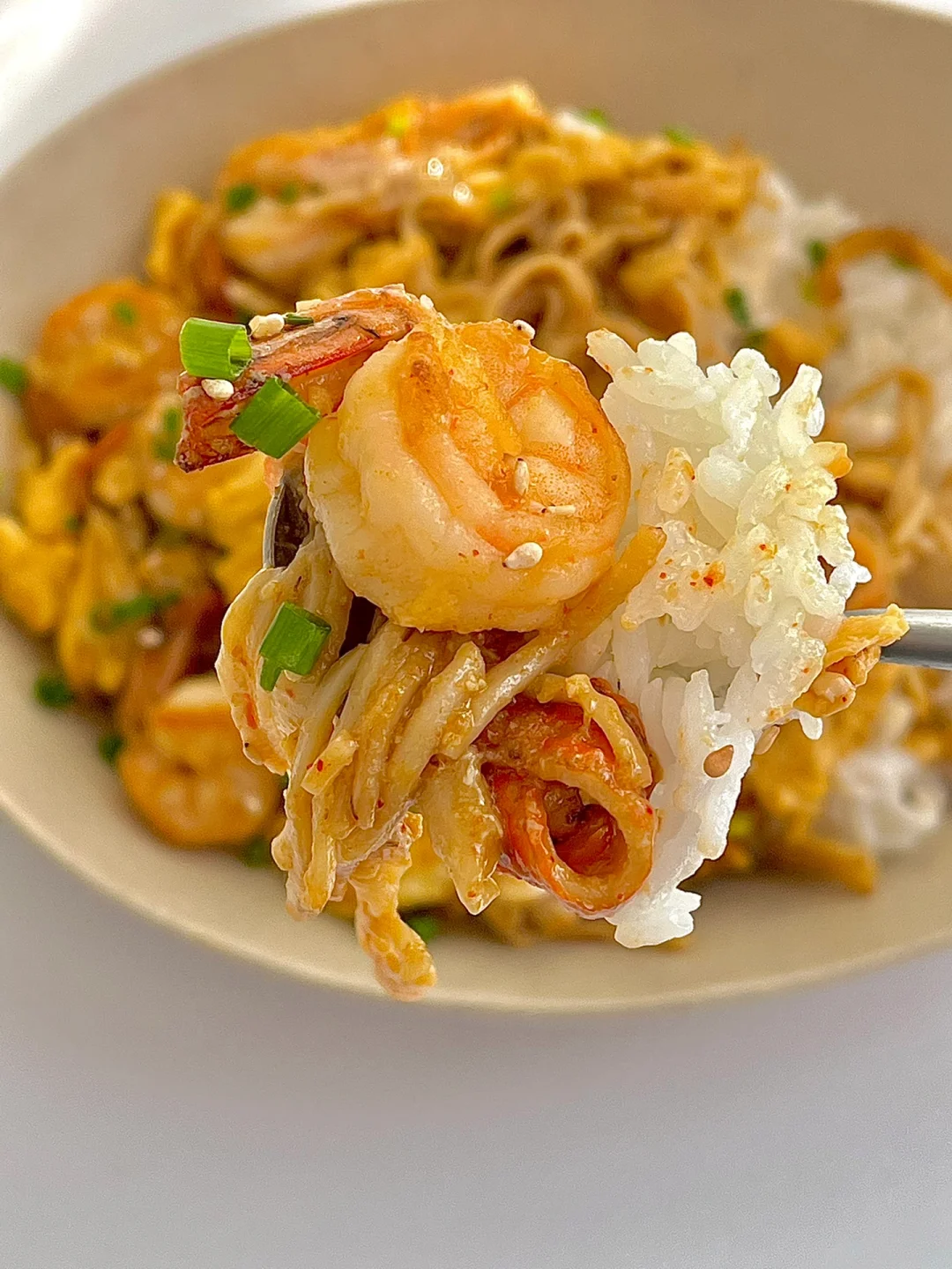 5️⃣加入鸡蛋翻炒,再倒入酱汁炒浓稠即可。