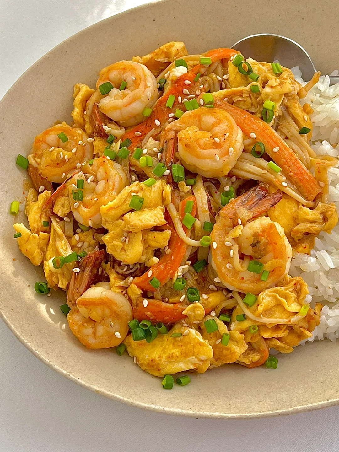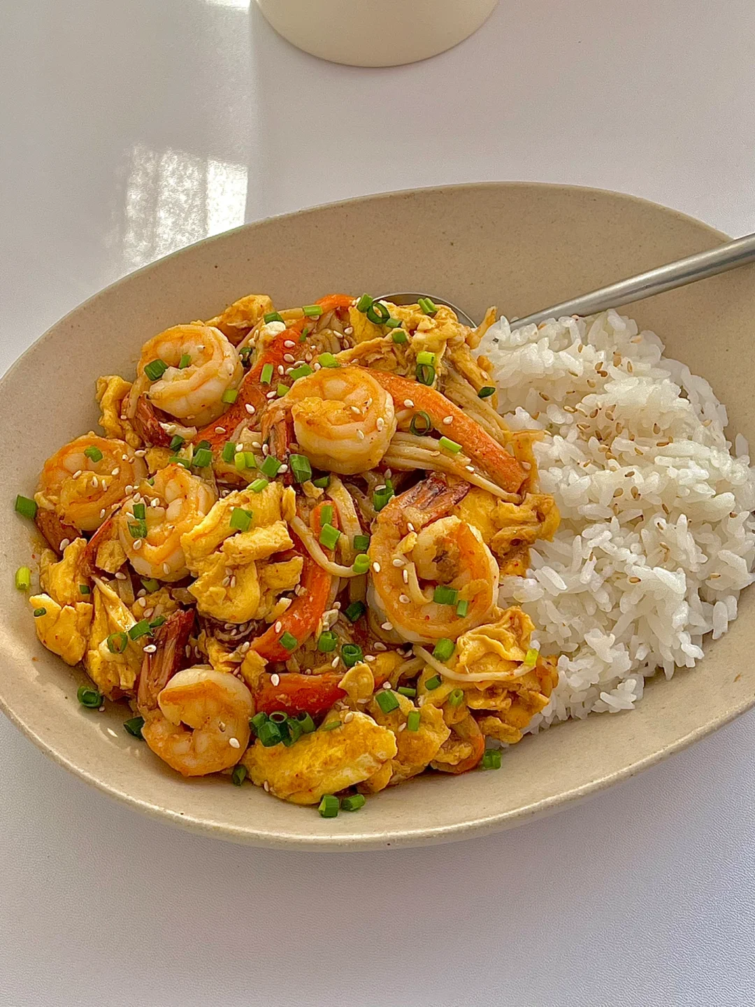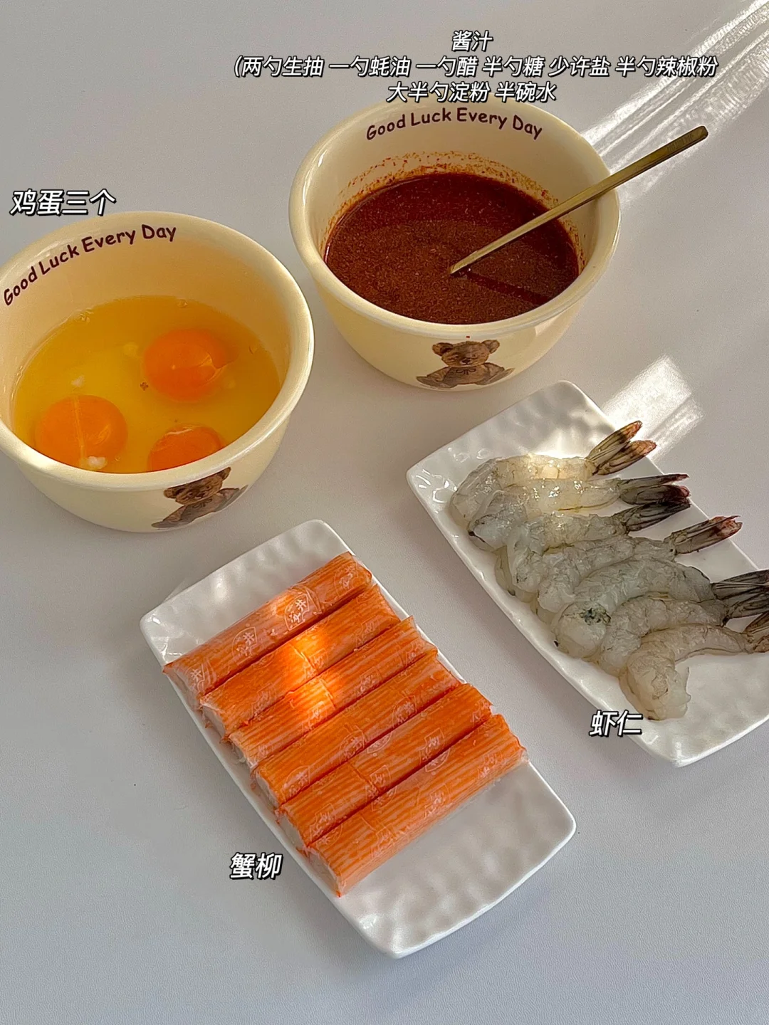 食材:鸡蛋三个 蟹柳六个 虾仁 酱汁(两勺生抽 一勺蚝油 一勺醋 半勺糖 少许盐 半勺辣椒粉 半勺淀粉, 大半碗水)