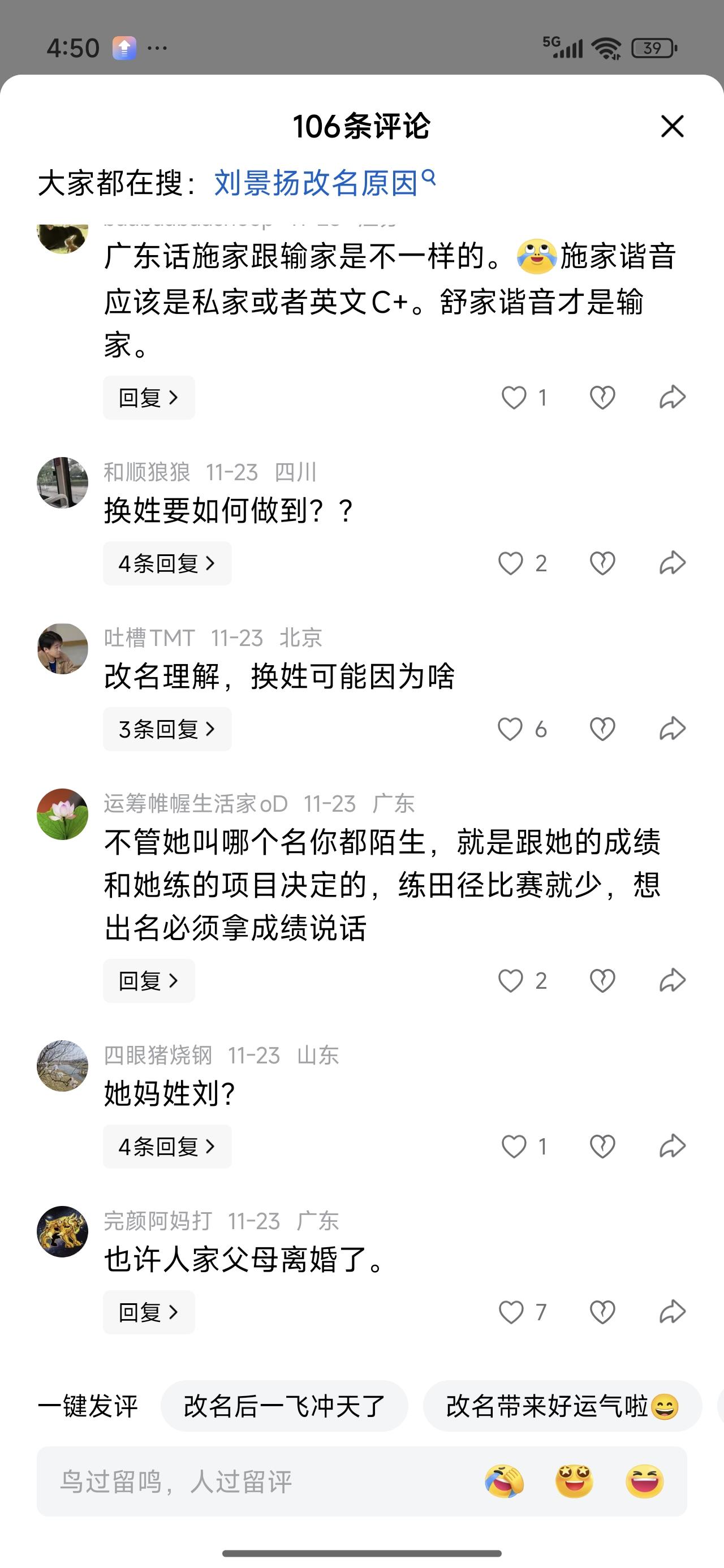 刘景扬改名了。她原来不叫刘景扬,原名叫施家莉。 我说怎么 一个跑了二十年的运动员竟然这么陌生,这下对上了。 有人说改名字是因为名字的谐音有点像输家莉,所以就改成了跟妈妈姓。夺冠以后也没见采访父亲。可能有什么特殊情况,不得而知。 总之,有点意思,玄,妙不可言。 看肤色,室外的训练多了,看条件也不错。肌肉,线条,大腿,手臂。都妥妥的。赢下比赛,是实至名归的。以后还会有很多机会的。