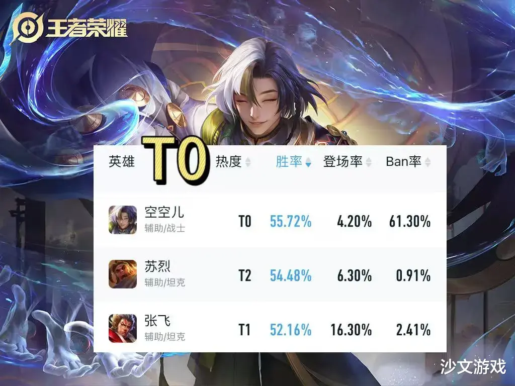 首先,排在巅峰赛游走位胜率榜T0的英雄有空空儿、苏烈、张飞,他们的胜率在52%至56%之间。作为游走位胜率榜前三,空空儿和苏烈的胜率都在54%之上,第三的张飞只有52.16%。
