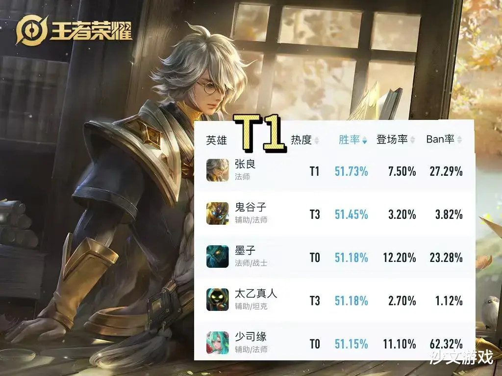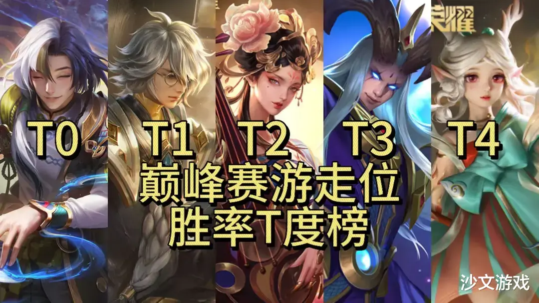 排在巅峰赛游走位胜率榜T1的英雄有张良、鬼谷子、墨子、太乙真人、少司缘,这些英雄的胜率在51%至52%之间。