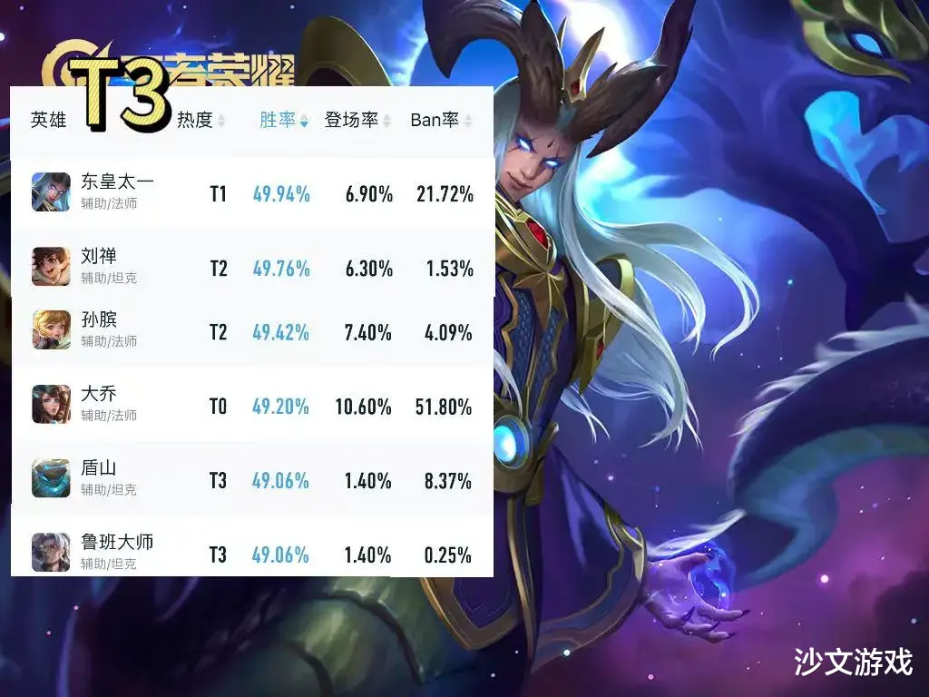 排在巅峰赛游走位胜率榜T3的英雄有东皇太一、刘禅、孙膑、大乔、盾山、鲁班大师,这些英雄的胜率在49%至50%之间。