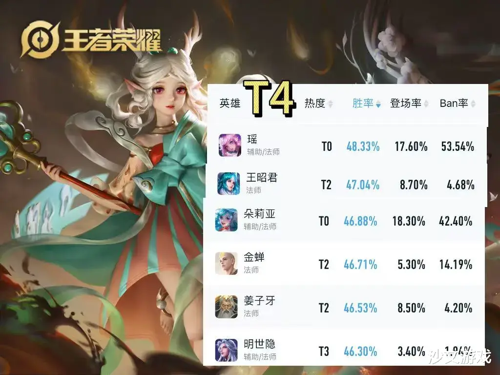 排在巅峰赛游走位胜率榜T4的英雄有瑶、王昭君、朵莉亚、金蝉、姜子牙、明世隐,这些英雄的胜率在46%至48%之间。
