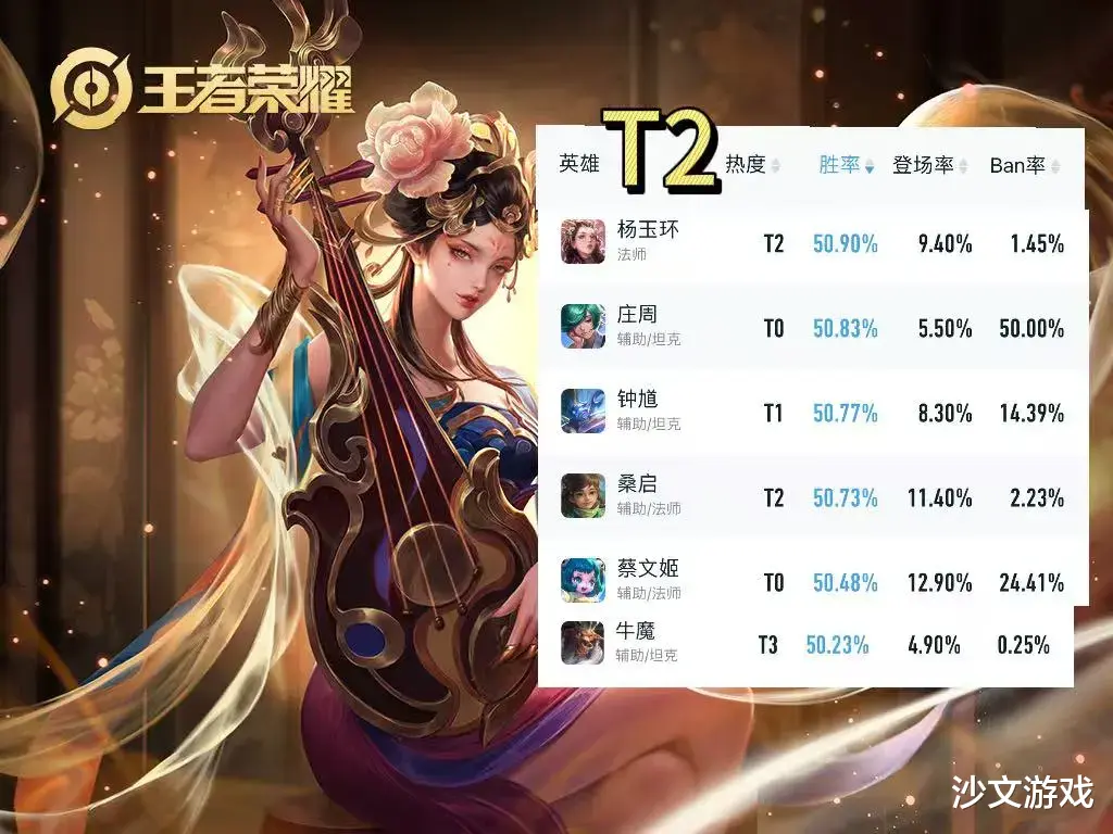 排在巅峰赛游走位胜率榜T2的英雄有杨玉环、庄周、钟馗、桑启、蔡文姬、牛魔,这些英雄的胜率在50%至51%之间。