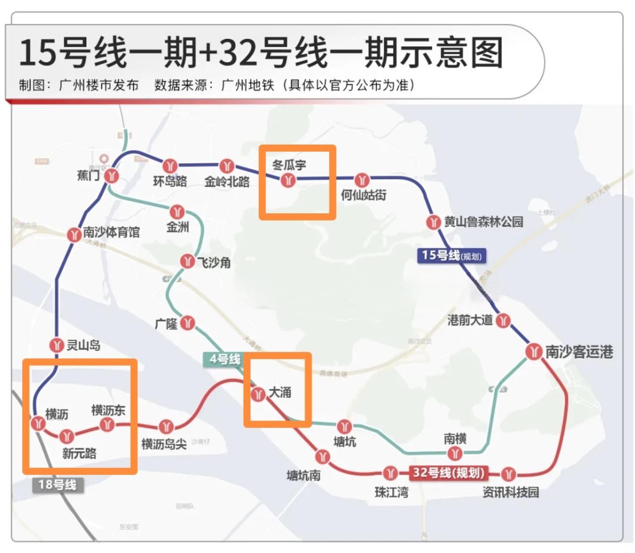 广州地铁32号线 广州地铁32号线(南沙地铁2号线)规划一出,真是让人期待值拉满!它是广州市远期规划的重要轨道交通线路,作为南沙"环+放射"轨道网络的组成部分,全长32.5公里,起于南沙客运港站,终至榄核站,主要服务南沙区发展,未来计划分两期建设并与佛山地铁系统衔接。 一期规划5座车站(南沙客运港-横沥东),远期总设站17座。枢纽站包括 南沙客运港站(换乘4/15号线),横沥东站(换乘31号线),榄核站(换乘26号线/佛山3号线)。枢纽站的设置让换乘变得轻松。有了它,南沙的交通网络更完善,相信会带动周边的商业、旅游等各方面发展,南沙的未来一片光明! 未来将实现广州17/26/33号线与佛山3/11/13号线的多线换乘,助推广佛同城化。