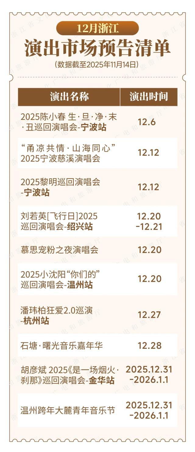 浙江的冬日从不因温度而沉寂。走进12月,清冽的空气里酝酿着加倍炽热的演出激情,让大家在歌声里,汲取足以抵御寒冬、迈向新年的温暖与力量。
