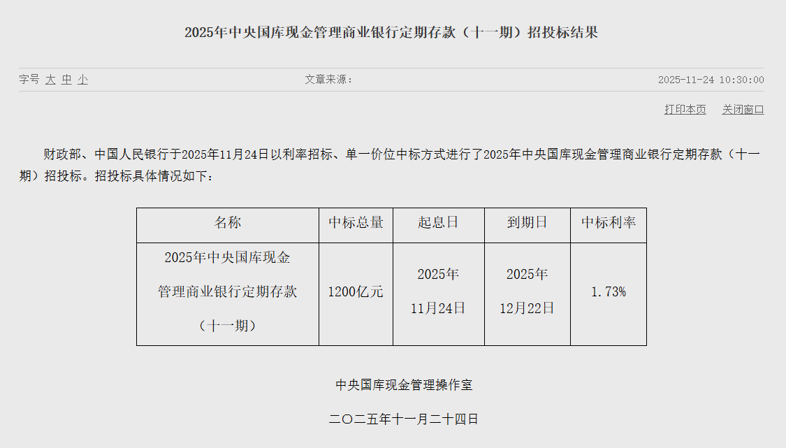 11月24日,财政部、中国人民银行于2025年11月24日以利率招标、单一价位中标方式进行了2025年中央国库现金管理商业银行定期存款(十一期)招投标。中标总量1200亿元,2025年11月24日起息,2025年12月22日到期,中标利率1.73%。