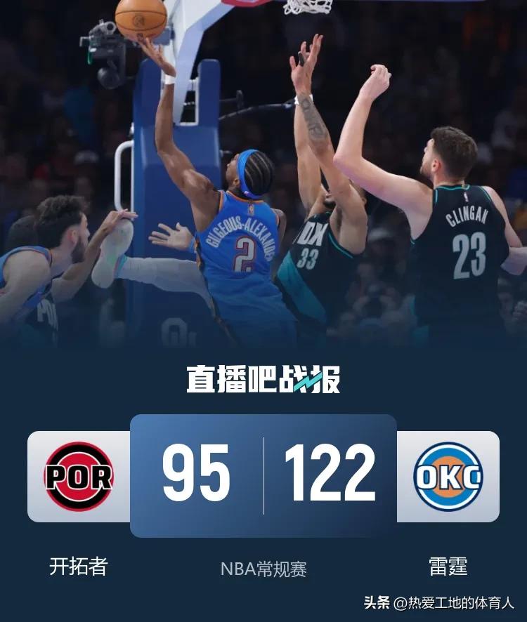 NBA常规赛继续进行 雷霆主场122:95大胜开拓者完成复仇 杨瀚森拿到了8分4篮板3助攻1抢断1盖帽,开拓者仅格兰特拿到最高的21分,其他人均未超过11分,开拓者手感冰凉惨败雷霆。雷霆这边亚历山大再次三节打卡,出战30分钟高效砍下37分,替补席的米切尔8投全中拿到20分,恭喜雷霆豪取九连胜! 开拓者阵容 开拓者阵容调整 开拓者队史球星 雷霆篮球