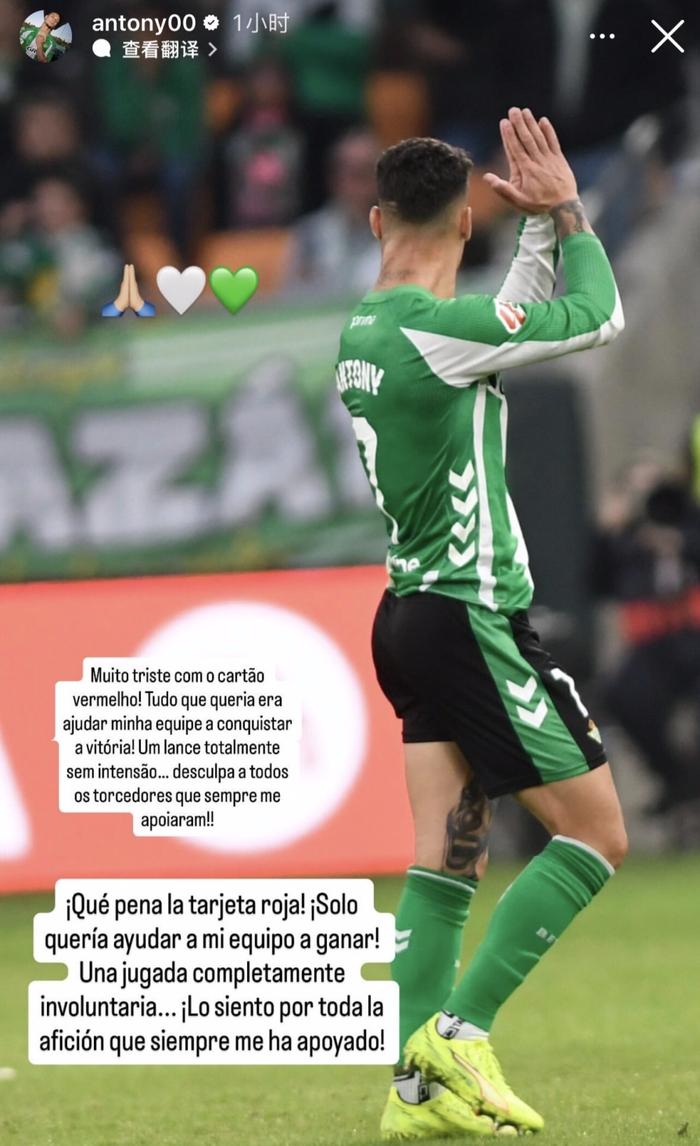 心态失衡?25岁安东尼补时倒钩爆头对手!染红缺战德比,贝蒂斯欲申诉 在北京时间11月24日结束的西甲第13轮一场焦点战中,皇家贝蒂斯在主场1-1被赫罗纳逼平。而本场比赛,贝蒂斯阵中的25岁的巴西边锋安东尼,在补时阶段因为心态失衡爆头对手被罚下。