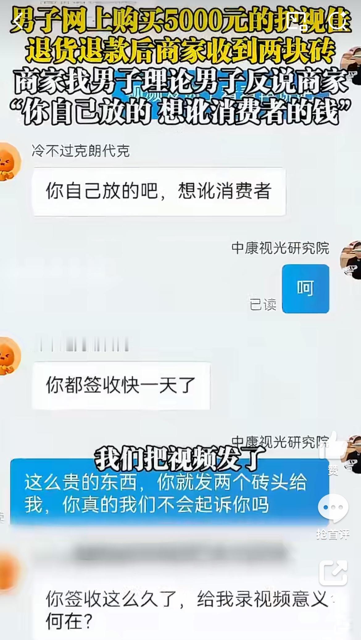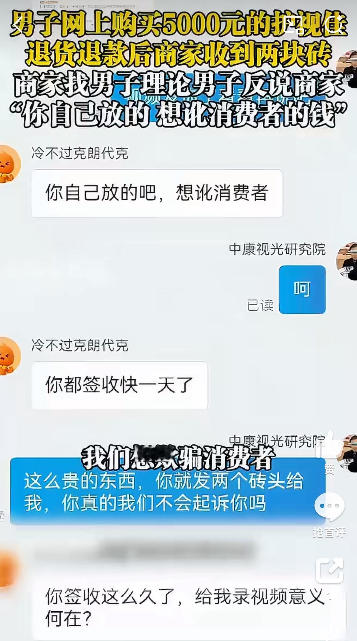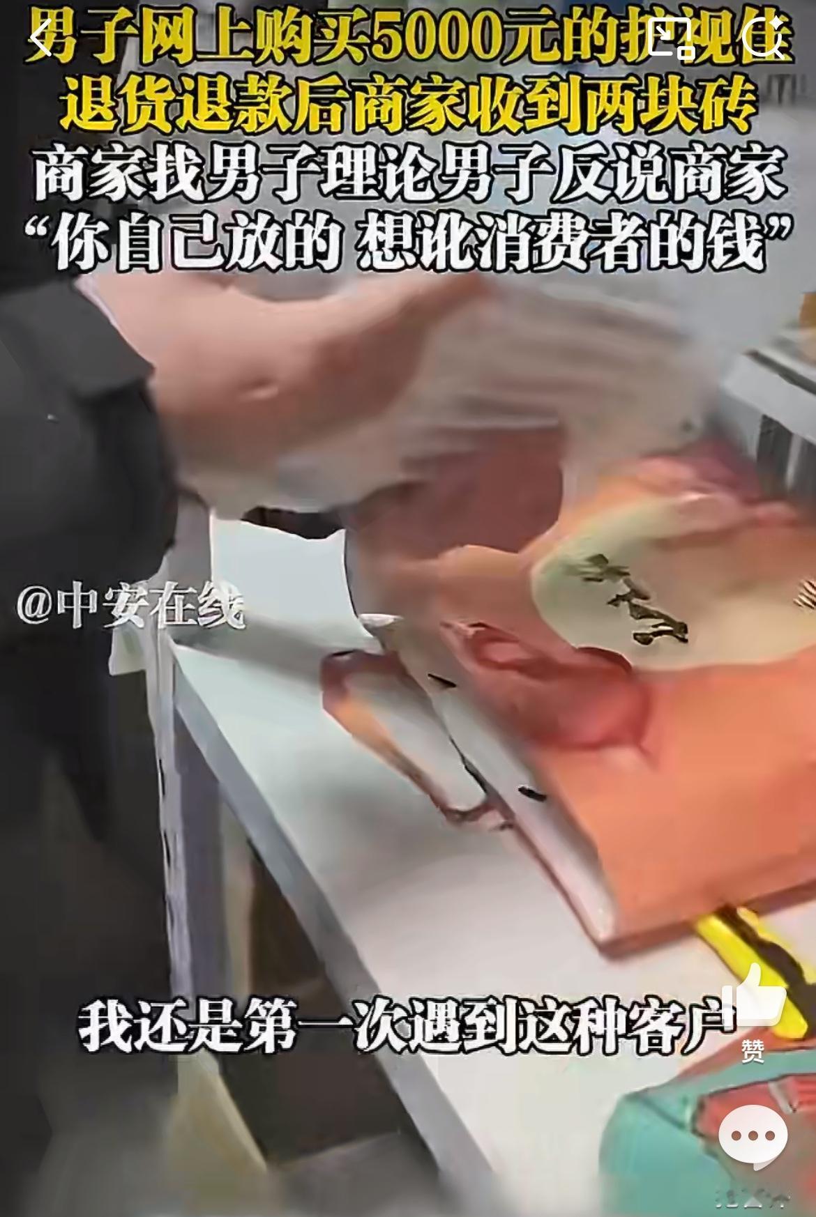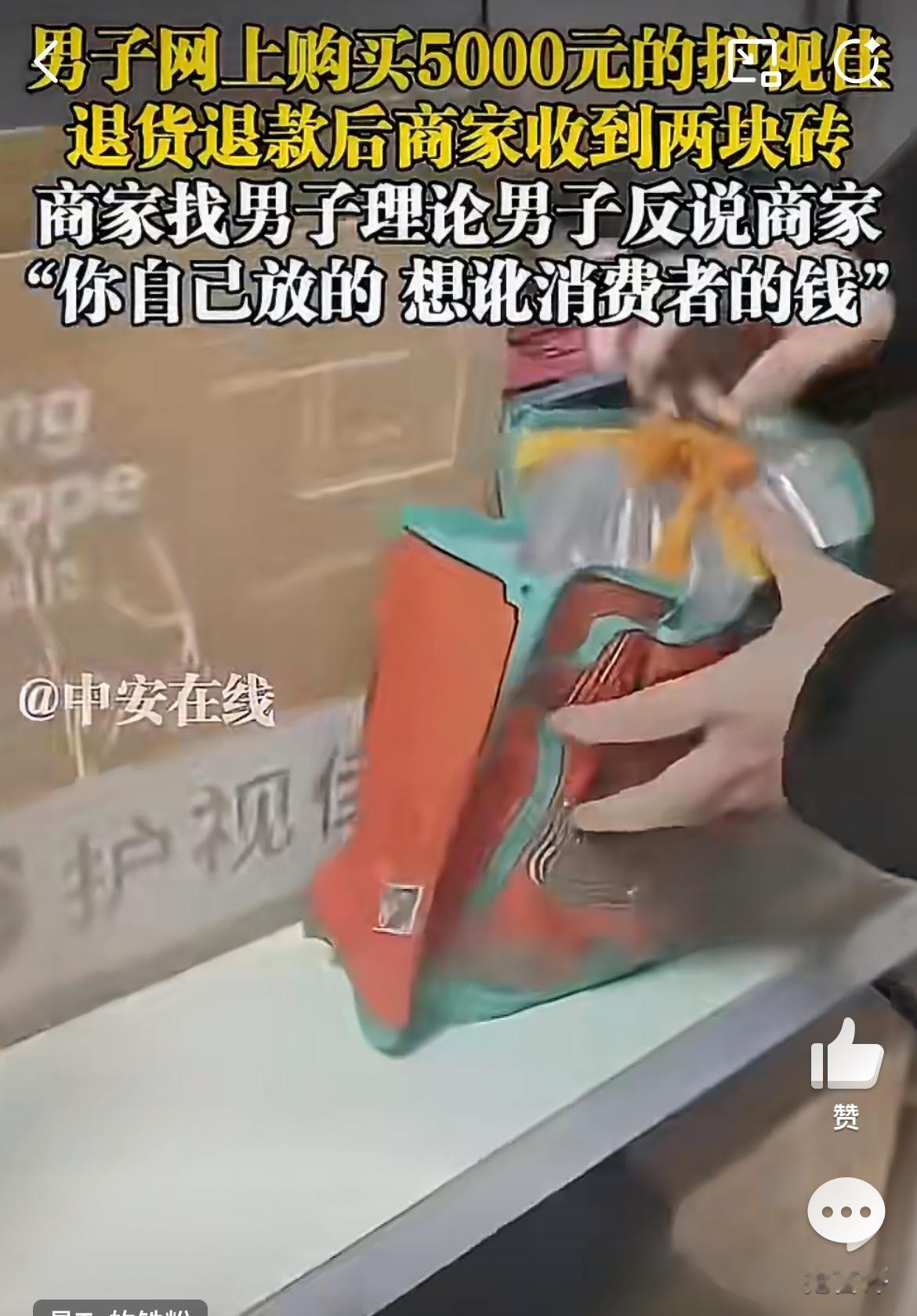 商家曝光,一男性顾客在网店里购买两个价值5000的护视佳,申请退货退款,结果款收到后,商家只收到两块砖头,让商家无语到极点。商家私信联系男子,男子却说是他们故意讹诈。对于这样的事情,商家不知道该怎么办。这些无耻的人,利用平台有利于消费者的规则,肆意薅商家的羊毛,可是这不是几块钱的东西,可是5000块啊。