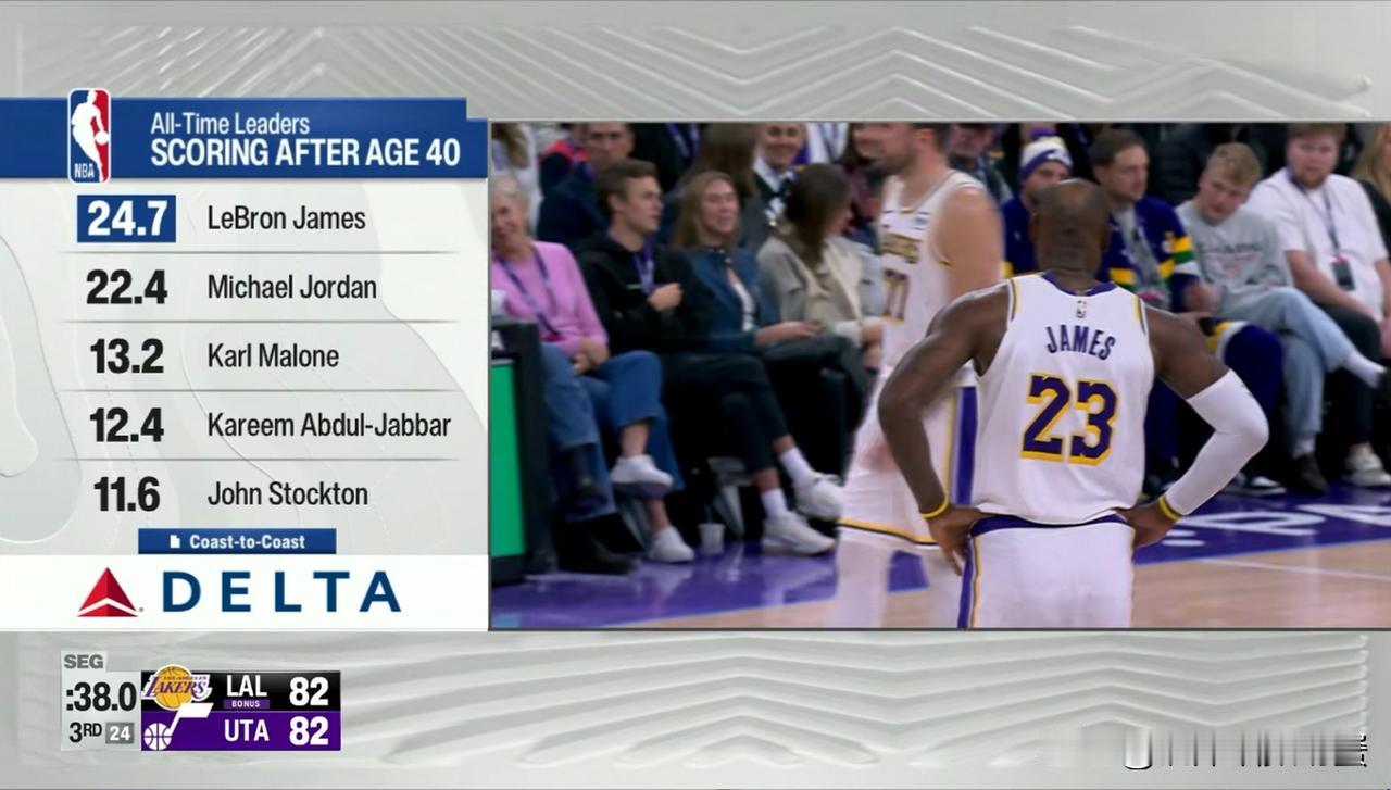 湖人超级球星詹姆斯绝对是NBA历史上最伟大的球员,并且没有之一!在今天进行的湖人和爵士的比赛中,当时比赛进行到了第三节的最后时刻,当詹姆斯即将执行罚球的时候,转播方给出了一组关于詹姆斯的数据,数据显示,在NBA历史上,詹姆斯在40岁以后场均可以得到24.7分,力压篮球之神迈克尔-乔丹,成为了NBA历史上球员在40岁以后场均得分最高的球员。 毫不夸张的说,就凭这项成就,詹姆斯就完全可以取代乔丹成为NBA的GOAT。