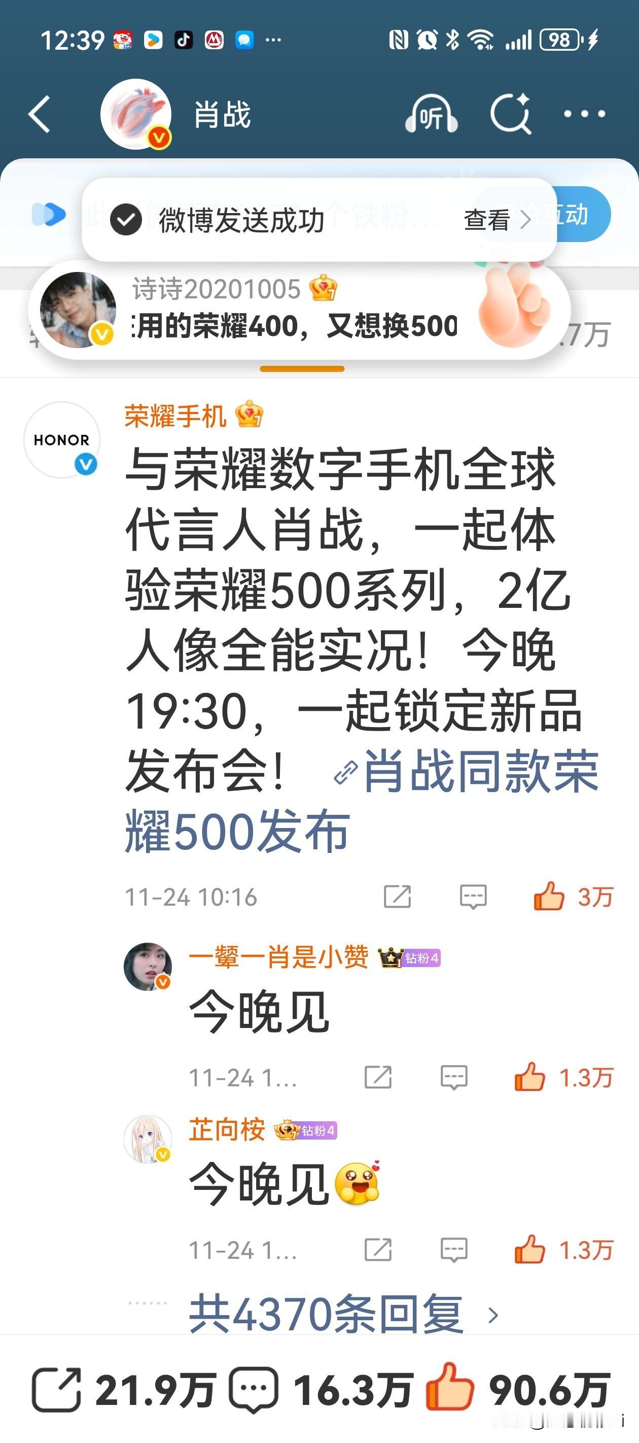 今晚7:30分,锁定肖战荣耀500新品手机发布会