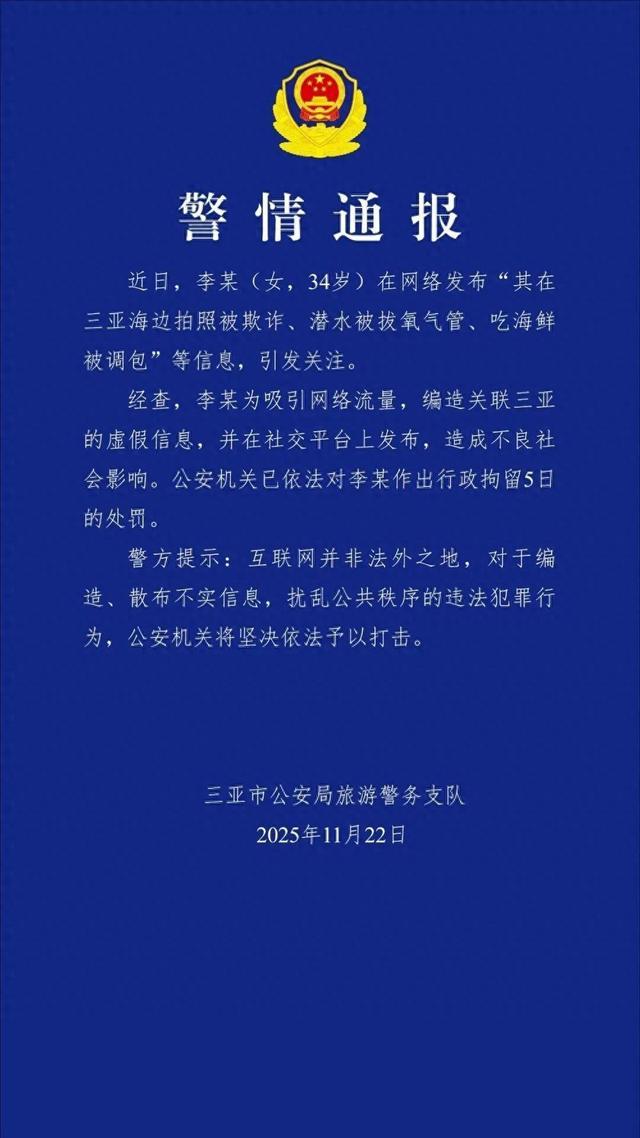 11月22日晚,海南三亚市公安局旅游警务支队发布警情通报。通报称,近日,李某(女,34岁)在网络发布“其在三亚海边拍照被欺诈、潜水被拔氧气管、吃海鲜被调包”等信息,引发关注。经查,李某为吸引网络流量,编造关联三亚的虚假信息,并在社交平台上发布,造成不良社会影响。公安机关已依法对李某作出行政拘留5日的处罚。这则新闻读来,着实令人唏嘘。