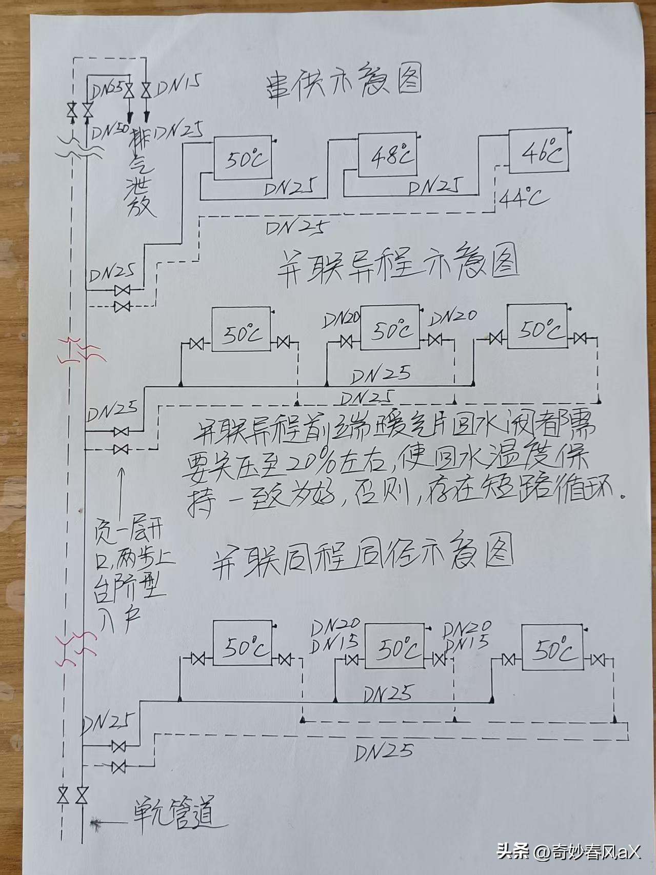 所有嫌弃自家用暖不热的,都可并联接入散热设施(暖气片和地暖管)——增大自家的散热冗余量。原则可直至达到你满意为止。这好比天冷了要多穿衣服的道理是一样的。 切记,家中是串供连接的在并联接入时,一并加装一旁通管。 切记,为了更方便简易的排气,所有户内高于暖气设施(暖气片和地暖分配器)的管道都必须改低—— 地暖的可以全部改为水平接入,或是由负一层开口以两步上台阶型连接分配器;所有暖气片的都必须以由负一层开口以两步上台阶型连接接入各组暖气片,每组暖气片并加装两个铜球阀控制。 切记,一定要去验证接入户内管道型号的大小(这里指的是内径)是否与单元(楼)主管道上的开口管径相匹配。塑料材质的内径多比同型号的(外径一样)热镀锌管小两个型号。 切记,串供的效能最低,地暖的热损耗太大(本是塑料管、又被水泥垫层包裹住再被地砖严密覆盖住)。 切记,家庭用暖只有并联同程同径的高效能连接方式可以采用。舍此别无他途。 以上告知,看完主动照此办理。准备好材料后一天内都可以完工,当晚见效且温暖你一生一世,从此再无用暖不热烦心事。