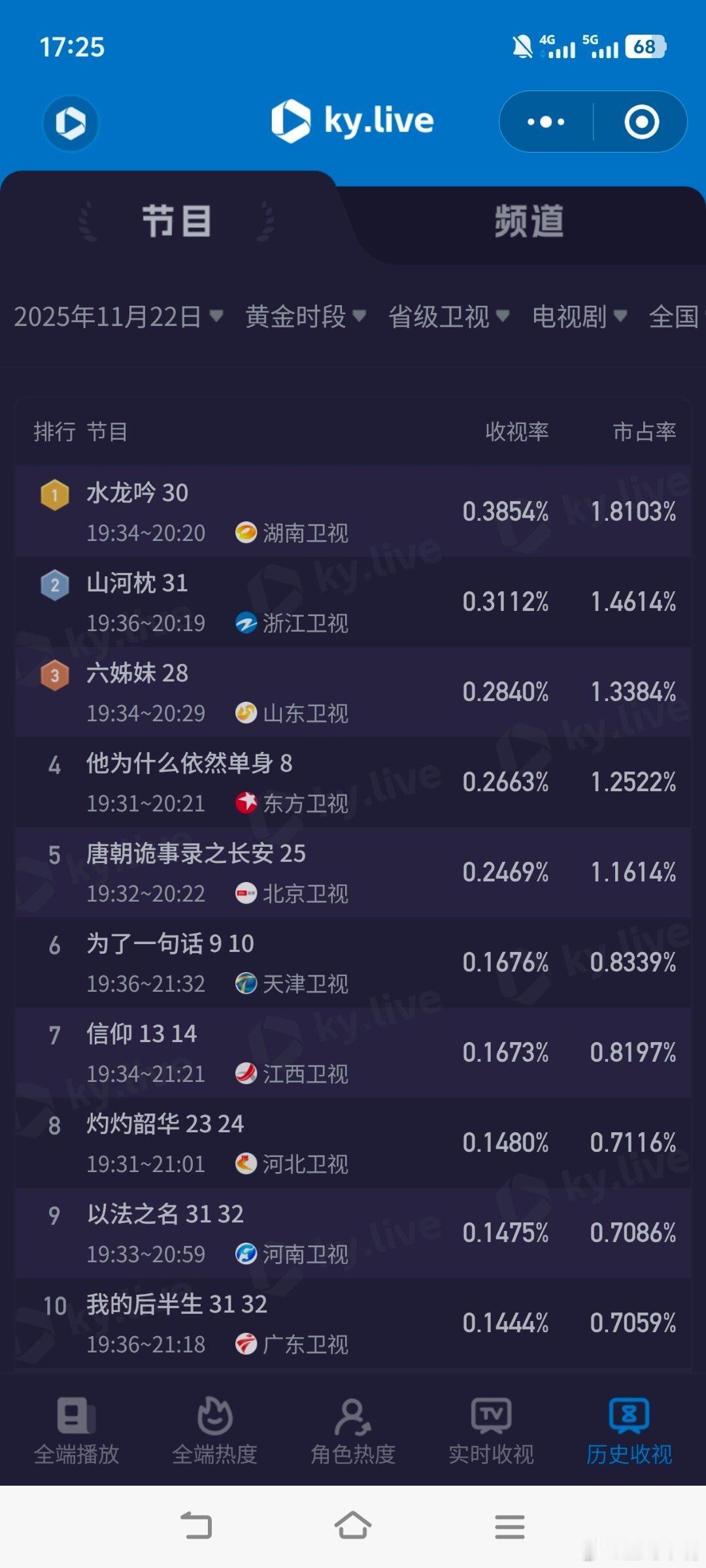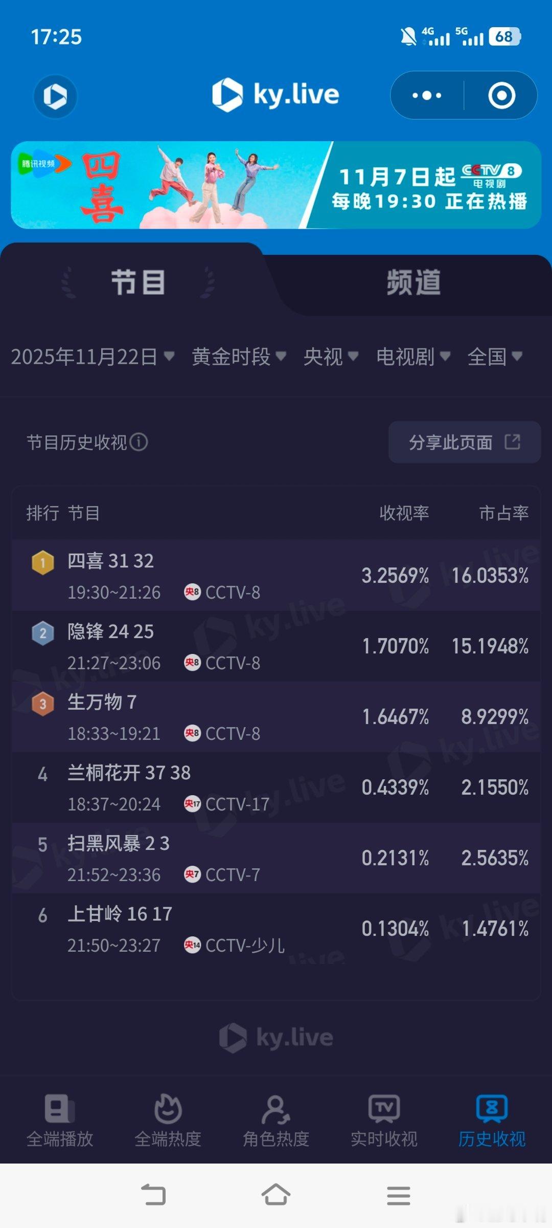 11月22日cvb收视日报,四喜创新高!四喜 2.587,酷云3.2569,系数0.794隐锋1.777山河枕0.340,酷云0.3112,系数1.092水龙吟0.248,酷云0.3854,系数0.643他为什么依然单身0.329,酷云0.2663,系数1.235唐朝诡事录之长安0.239,酷云0.2469,系数0.968