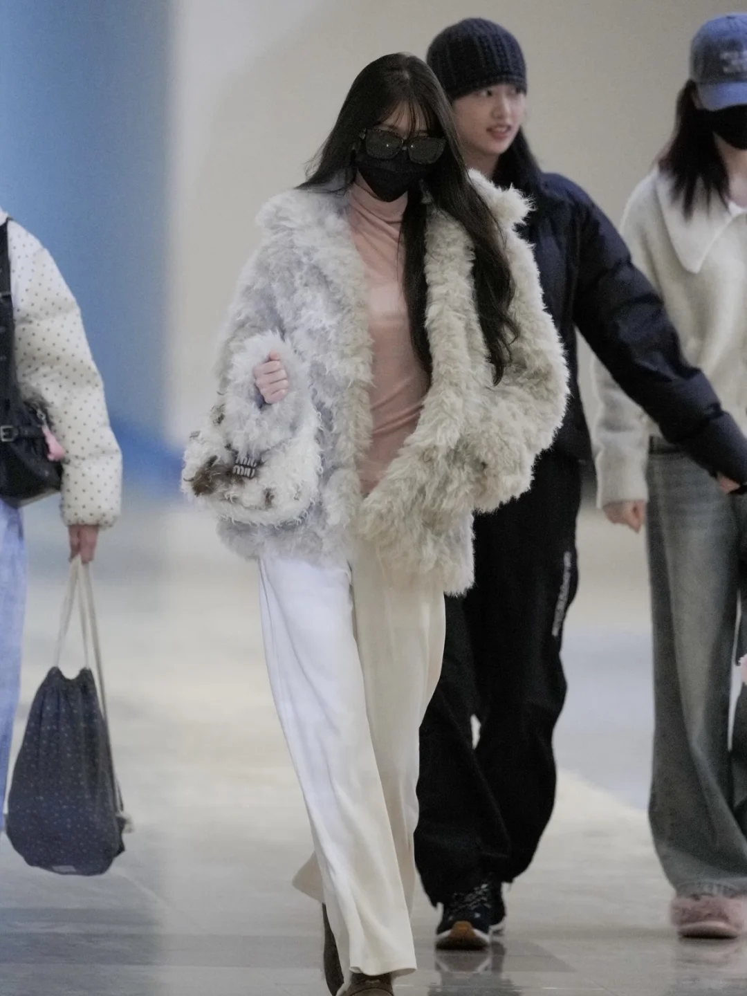 张元英这组机场图是把“温柔”俩字穿身上了吧! 软乎乎的卷毛外套像裹了床云朵被☁️ 内搭是奶fufu的裸粉高领,下装是垂顺的白色阔腿裤—— • 材质反差:毛绒的软+针织的贴+裤子的垂,层次感直接拉满 • 色系魔法:米白+裸粉=自带柔光滤镜,黄皮姐妹闭眼冲 • 松弛感:墨镜一戴谁也不爱,但抬手打招呼又甜得要命 冬天穿成这样,连风都是裹着糖衣的吧!想做“行走的棉花糖”就按这个公式来