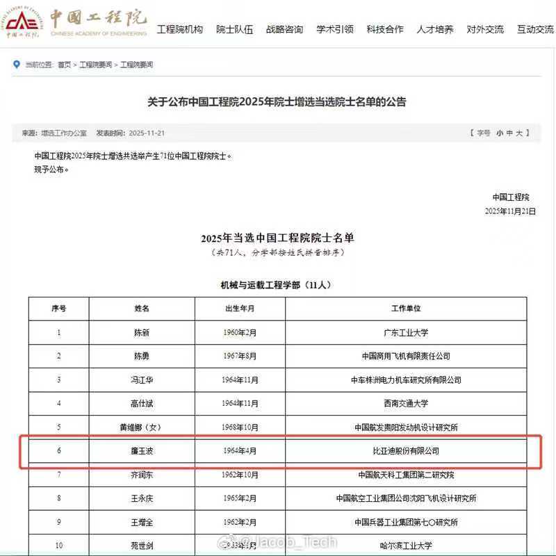 喂!上周 11 月 21 日中国工程院公布了新当选院士名单,比亚迪的首席科学家廉玉波老师成功入选啦,以技立身荣膺院士真的太为国产企业骄傲了!院士可是咱们国家工程科技领域的最高荣誉,能当选的都是行业里的顶尖大牛。廉玉波老师一直专注搞新能源汽车的核心技术研发,攻克了好多关键难题,这次当选绝对是实至名归作为新能源汽车行业的领军企业,比亚迪始终秉持工程师文化,持续聚焦技术创新。未来,比亚迪将继续以核心技术突破为目标,不断攀登新能源汽车技术新高峰,为推动中国汽车产业高质量发展注入更强动力