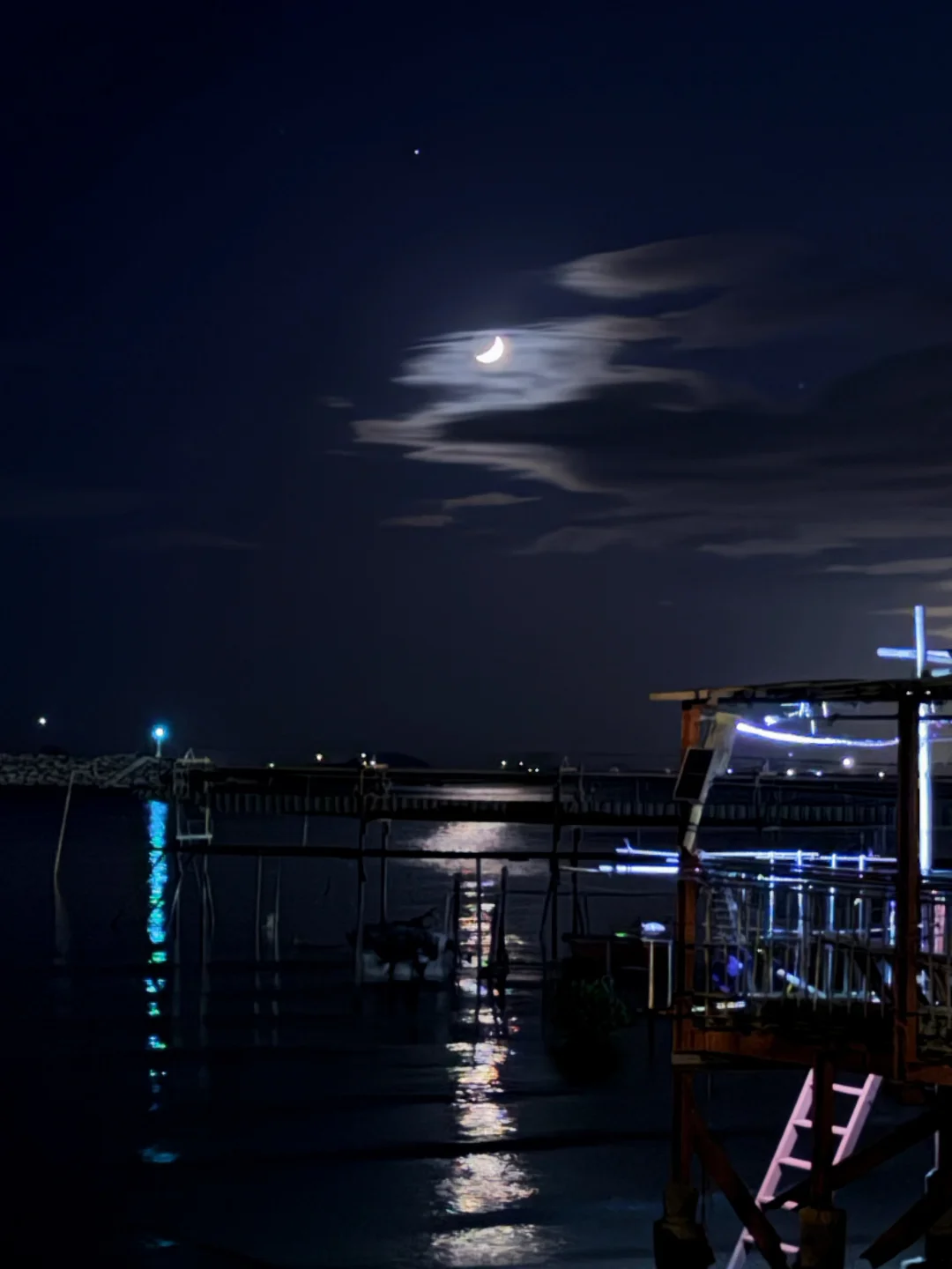 听浪潮拍案, 看星光落满海面, 看月牙弯弯躲藏在云后,