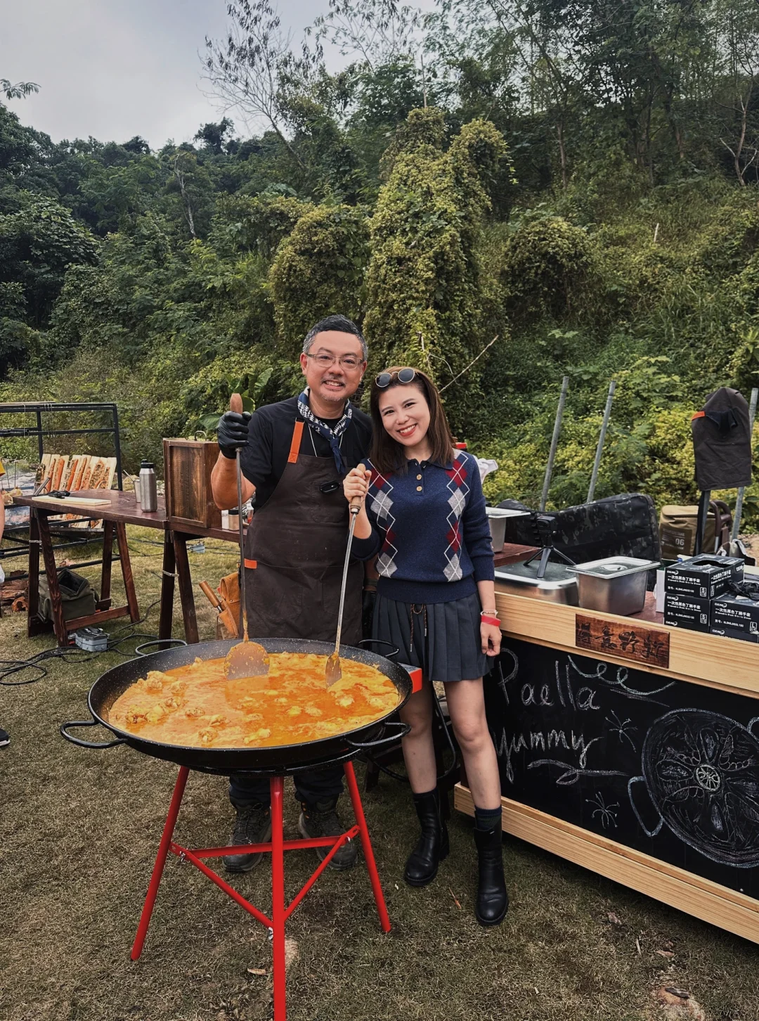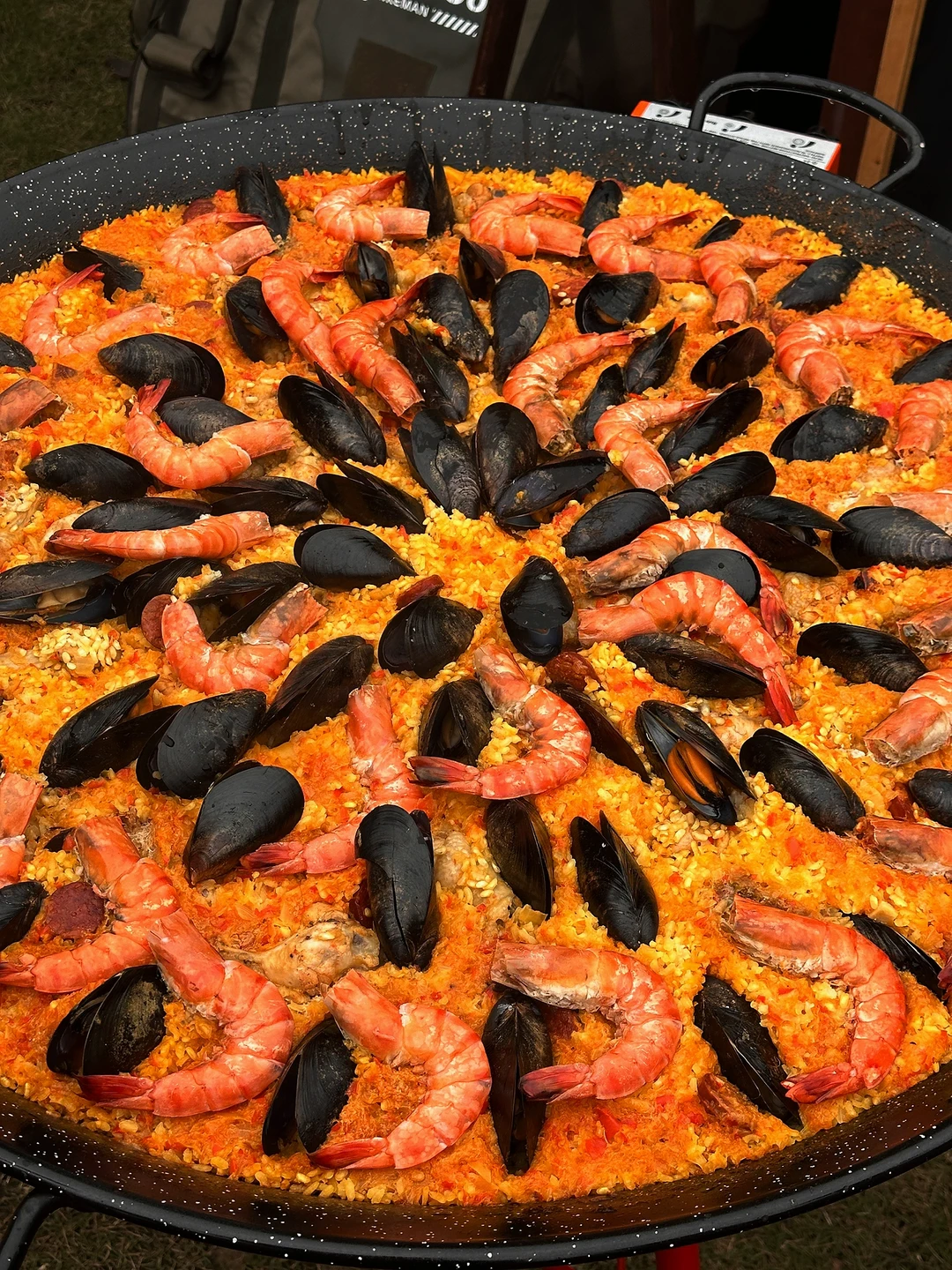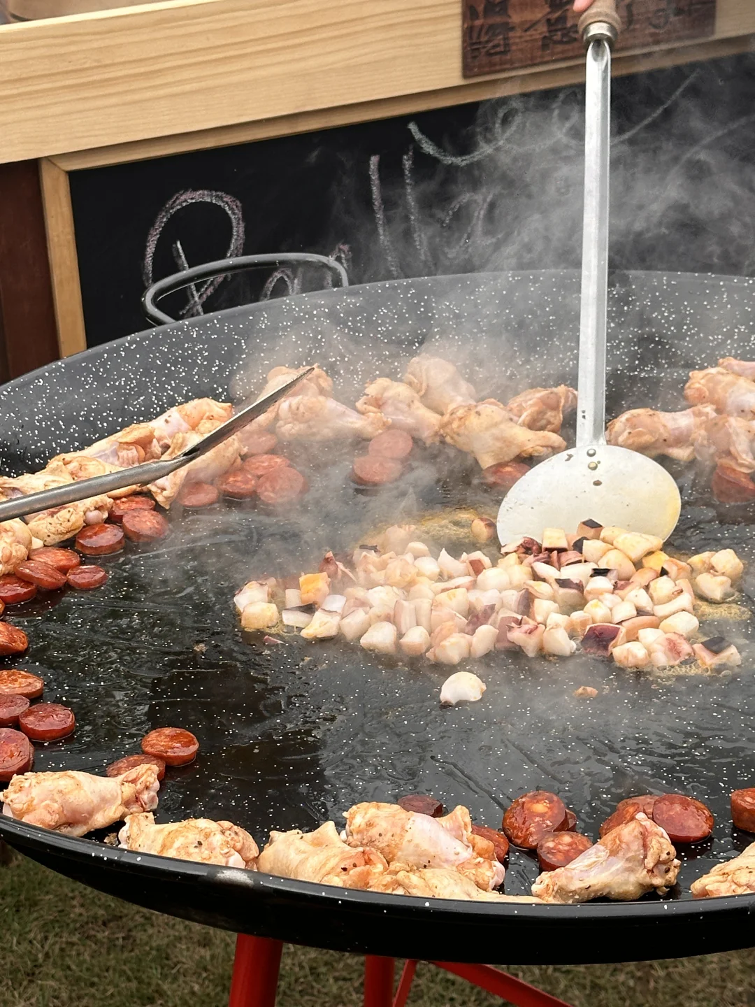 巨型的西班牙海鲜饭!曾经在马德里学过,这次在自然中就更好玩。大家一起围着巨大的平底锅,挥舞着锅铲,翻炒着各种新鲜的海鲜和米饭,欢声笑语不断。
