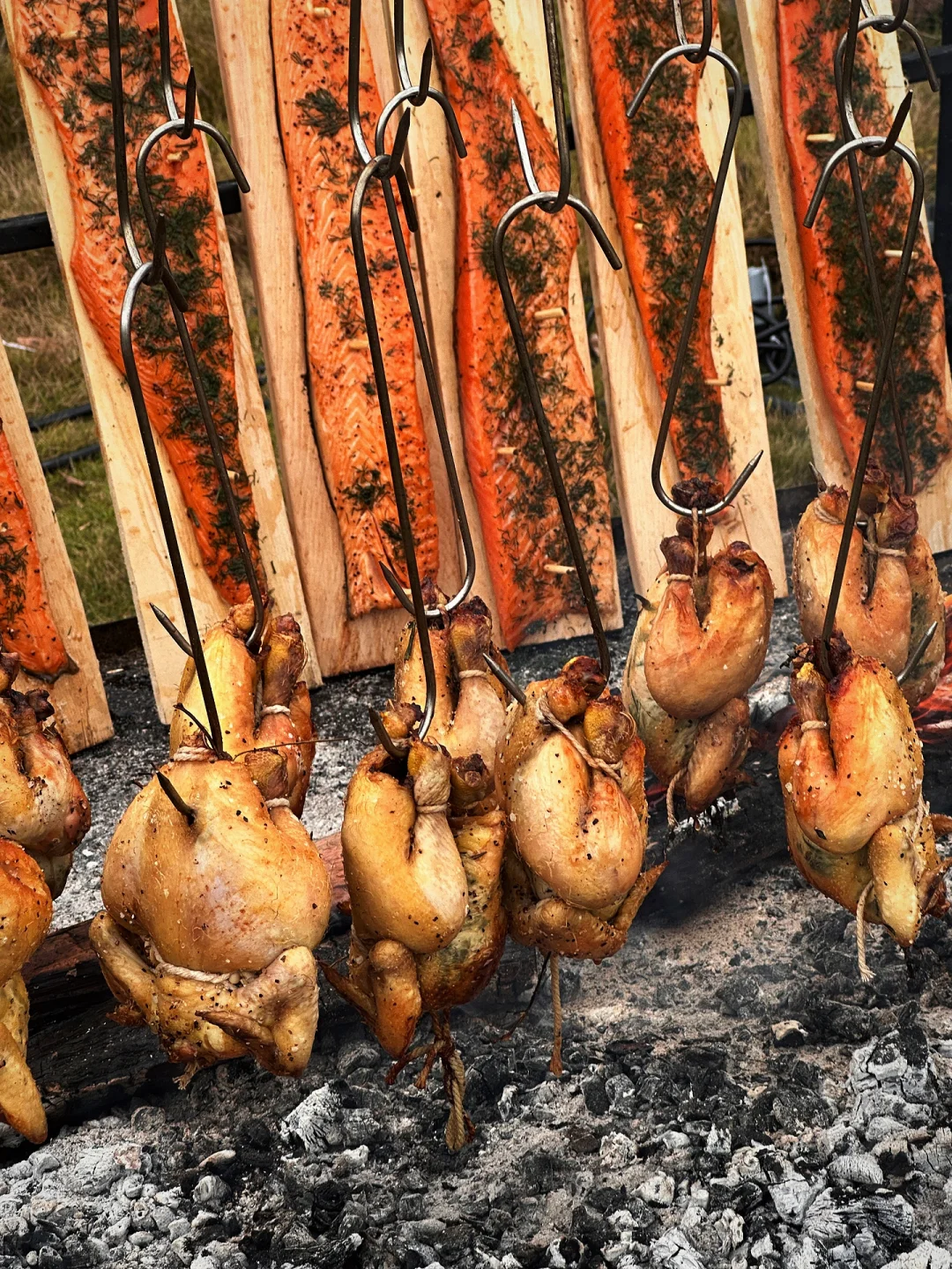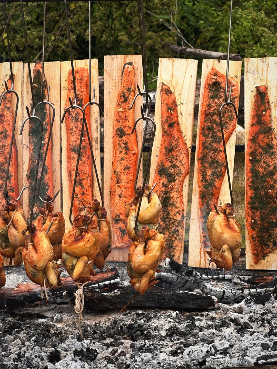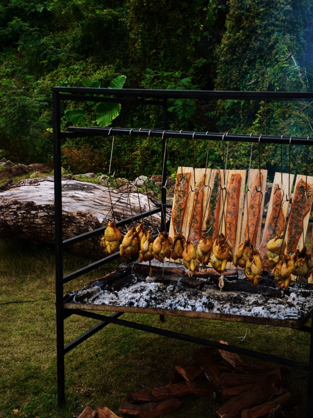 这次的直火料理不仅仅是简单的烹饪,更像是一场心灵的盛宴。我们围坐在篝火旁,火焰噼啪作响,荔枝木的烟熏香气弥漫在空气中,鸡肉、三文鱼等各种食材在火焰中滋滋作响,散发着诱人的香气,让人垂涎欲滴。