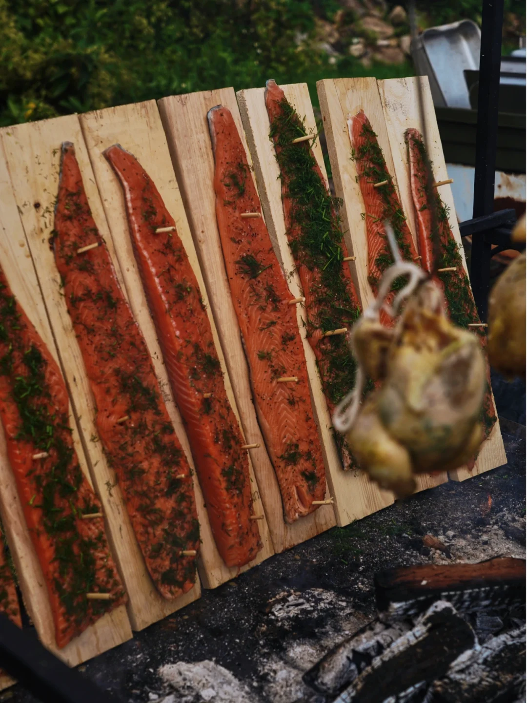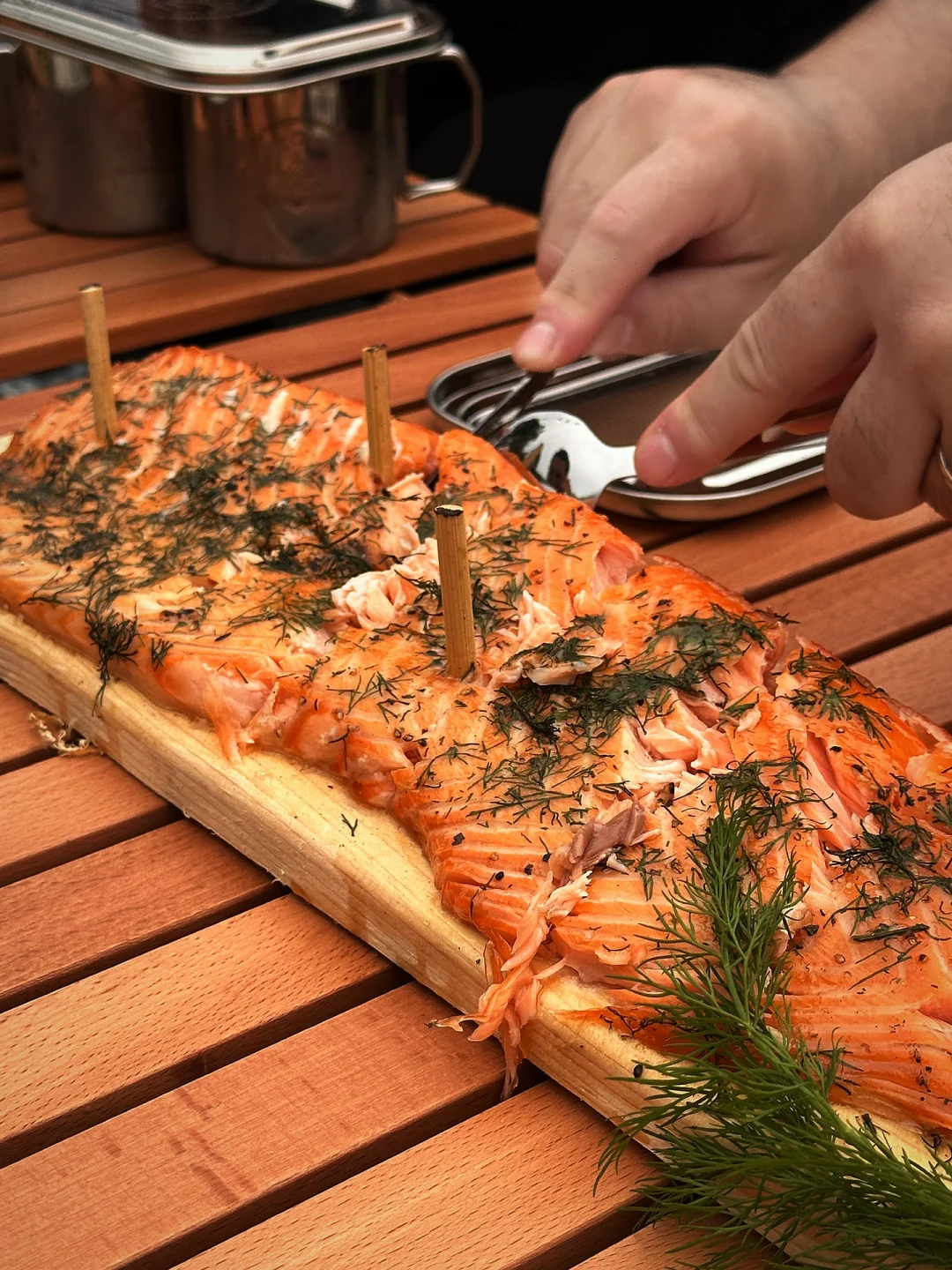 北欧烟熏三文鱼的制作也超级有趣!将新鲜的三文鱼钉在木板上,用盐和黑胡椒细细按摩,再用威士忌和枫糖浆腌制,最后放置在野炊架旁,用烟火慢慢熏制,那独特的烟熏味简直让人欲罢不能!