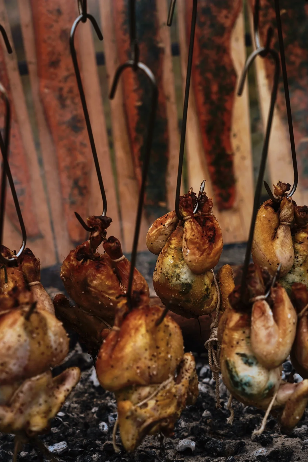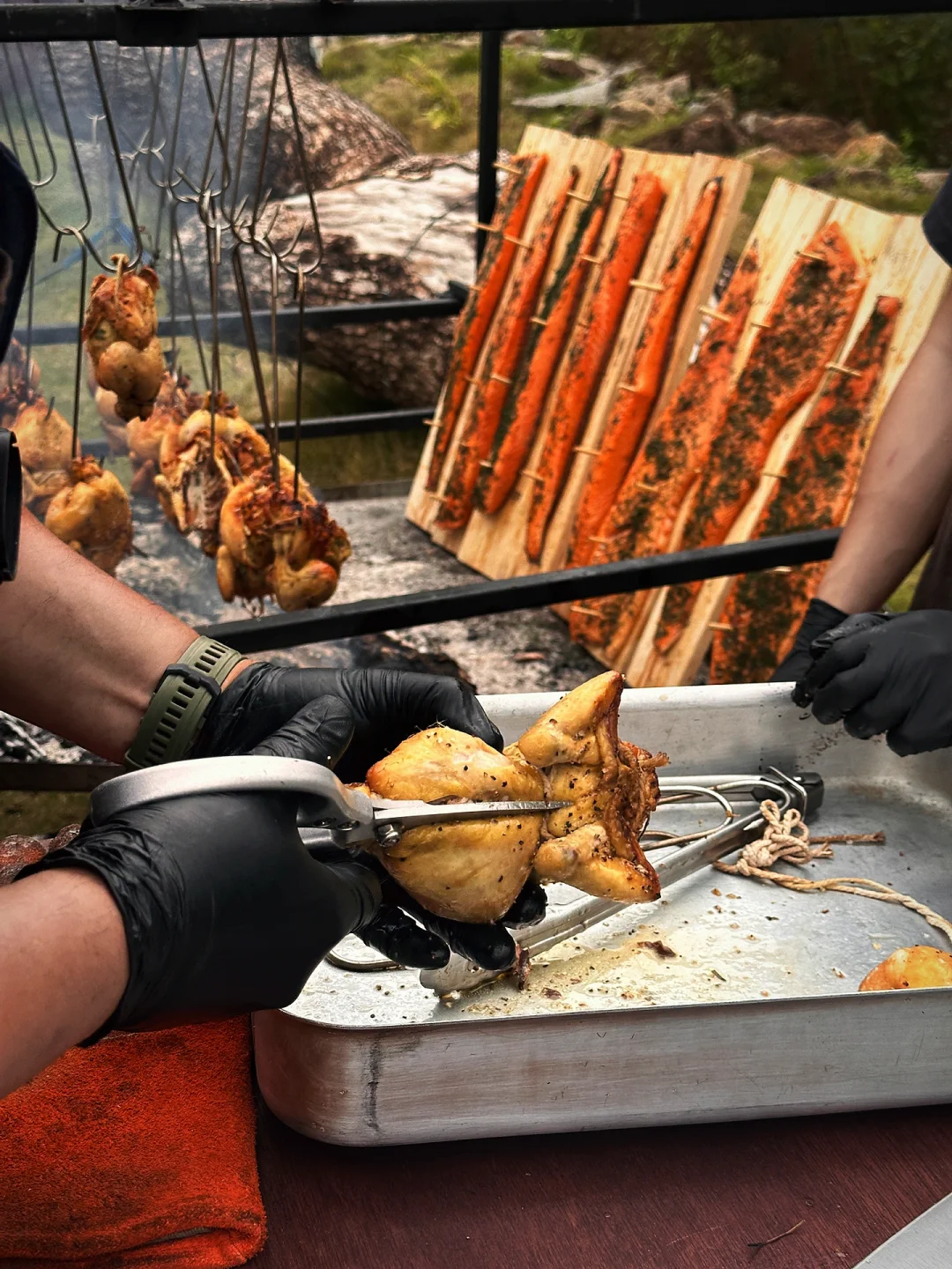 主厨David亲自传授秘籍,教我们如何处理食材。给整鸡抹上盐和胡椒,再在鸡肚子里塞进新鲜的迷迭香和浓郁的黄油,用绳子仔细捆绑好,然后倒挂在野炊架上,让火焰慢慢地烘烤,锁住每一滴鲜美汁水。