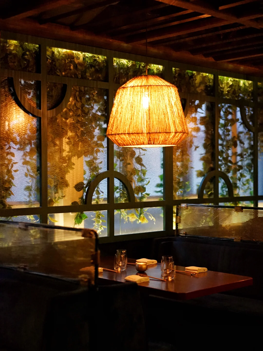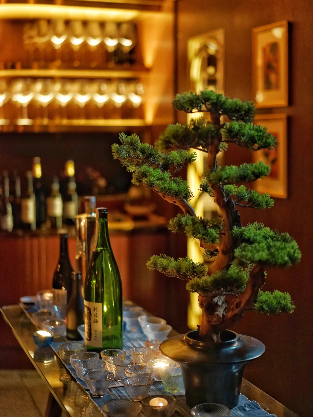 Honjo整体风格充满50年代复古摩登的气氛,有許多quirky的细节。可以窥探室外青葱植物的彩绘玻璃窗,沒有吧台但却很homey的bar area,充满复古未来感的吊灯,清酒的display table,端庄高雅却又不拘一格。