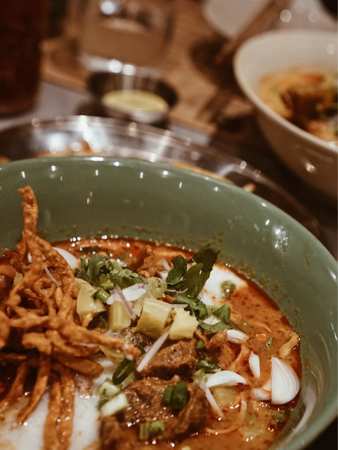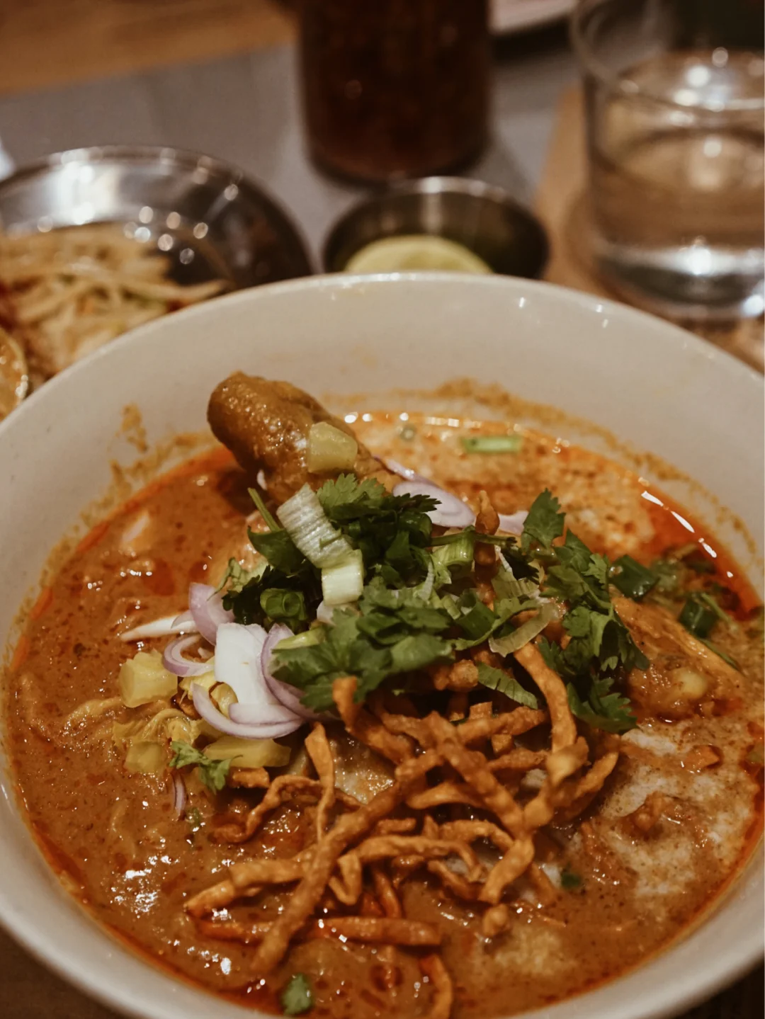 👍1⃣️泰北咖喱金面:这个咖喱汁实在味道太有层次了,我和丸子很戏剧化地说:我太幸福了!香甜不太辣,太适合我这种话江浙妹子的口味,据说咖喱汁是由十多种材料制成,味道浓郁。而蛋面是泰北直送的,非常柔韧,顺滑,伴着汤汁,此刻的我光写着就可以垂涎三尺。我们点了鸡和牛,都非常赞。