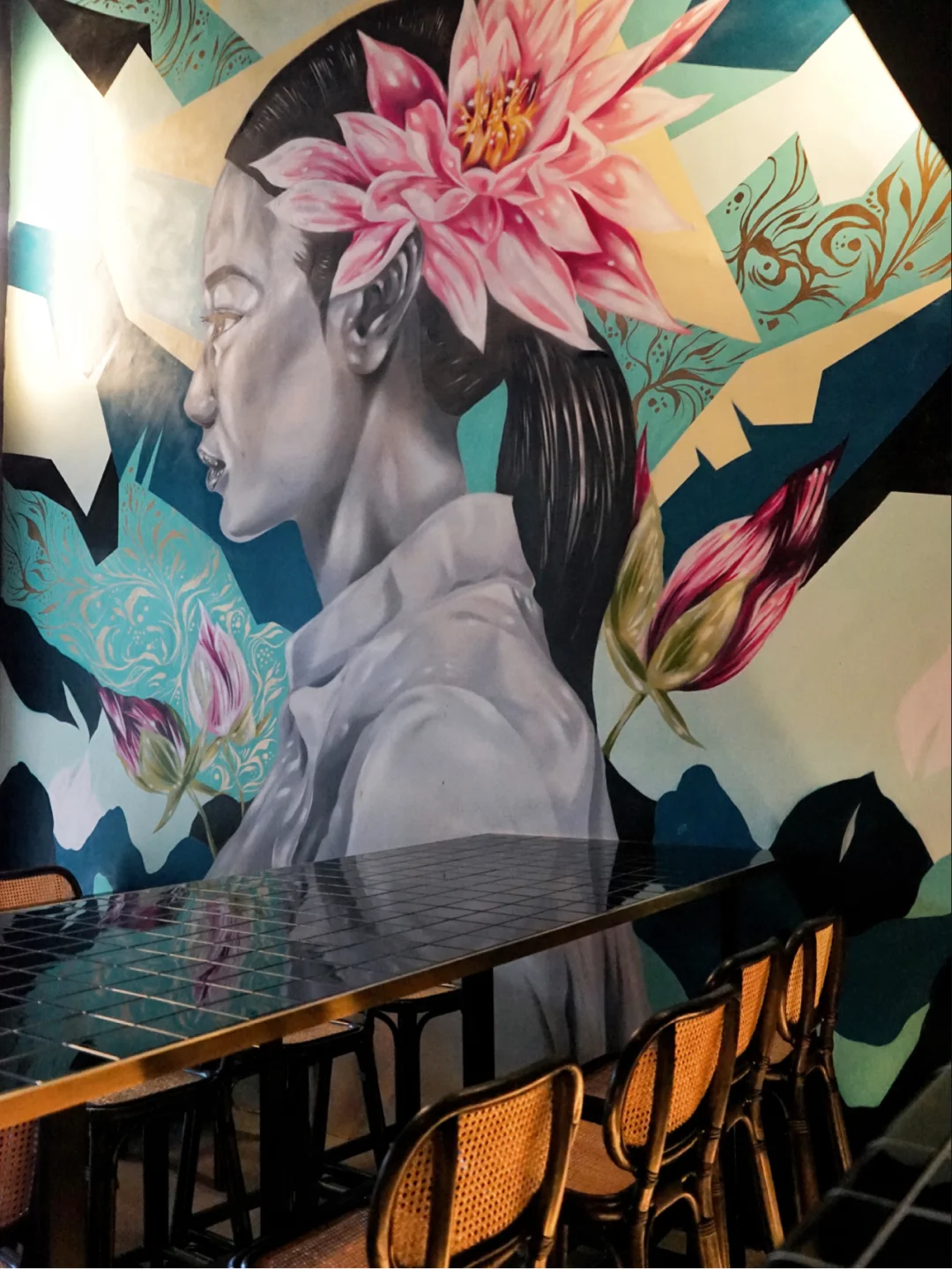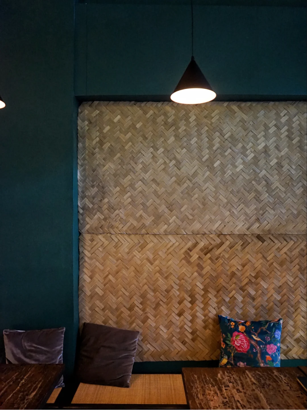 我很喜欢它的装修风格,传统与时髦完美结合,毫无违和感。黑色瓷砖的开放式厨房,温暖的射灯,高脚椅,墙身喷画的西贡小姐最为瞩目,充满越南的街头风情,再加上藤制装饰,传统复古花式的cushion,仿佛置身于胡志明的型格餐厅。