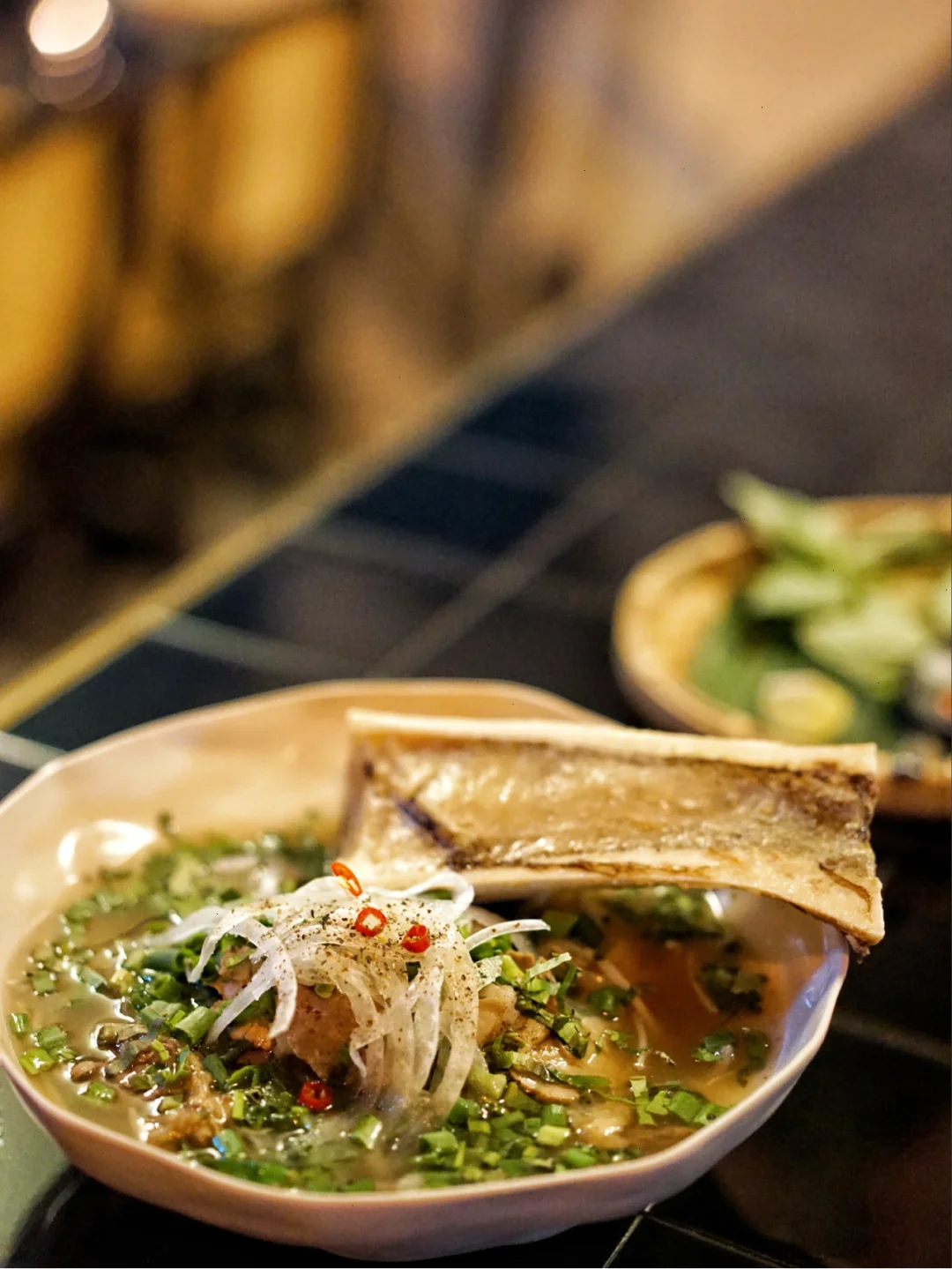 1⃣️X河粉+牛骨髓:据说河粉的汤底是用上20斤牛骨、沙虫干、香料熬制40小时制成。挖一勺英国巨型牛骨髓,配上生牛、牛丸、牛腩、香草,层次丰富,拌上海鲜酱,香甜而滑溜。