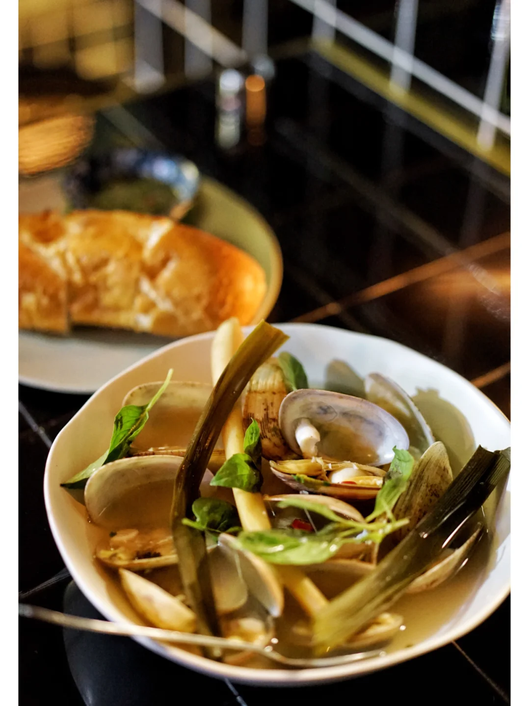 3⃣️斑斓椰子蚬汤+焗法包:用斑斓和椰子水煮的汤底,非常清甜,鲜美。花甲肥大,蘸上脆脆的法包,非常赞!