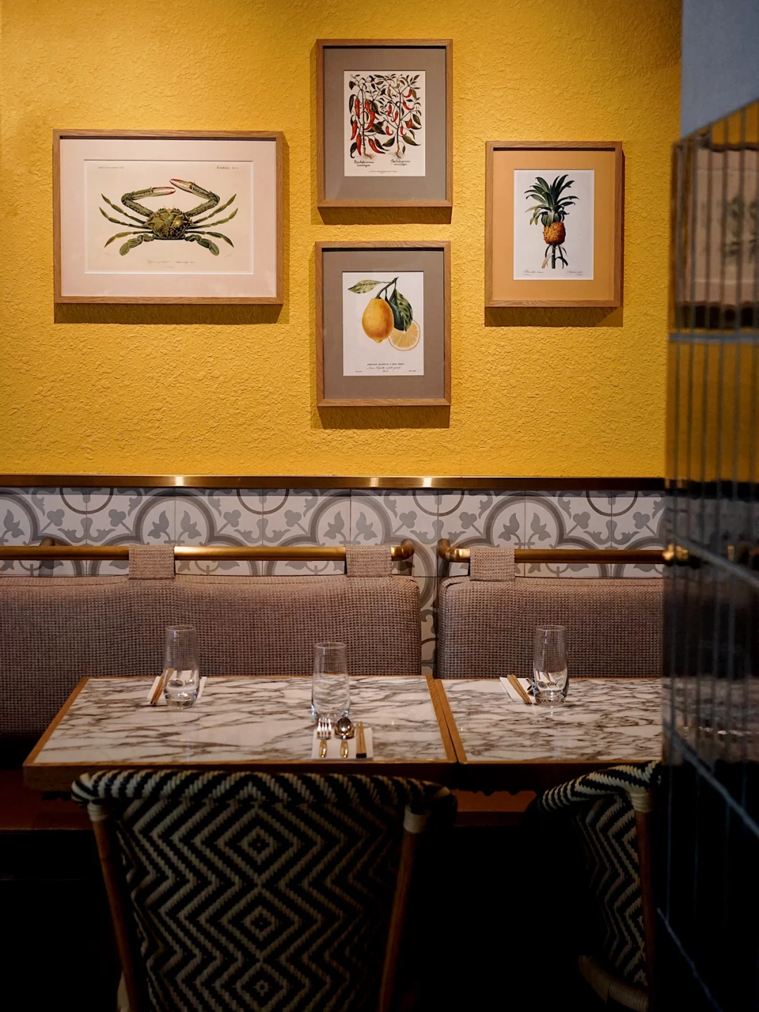 🧡我很喜欢这家店的装修,一抹明黄色的墙壁,很像法国殖民时代的越南建筑,彩色的瓷砖也充满了Indochina的风格,高脚的藤椅,墙上的竹编装饰,充满浓浓的湄公河三角洲的风情。然而,却有很多时尚的元素,门口的霓虹,餐厅里的金属结构世界地图,摩登的吧台。总之非常适合拍片。我和一起探店的小伙伴 都很喜欢。