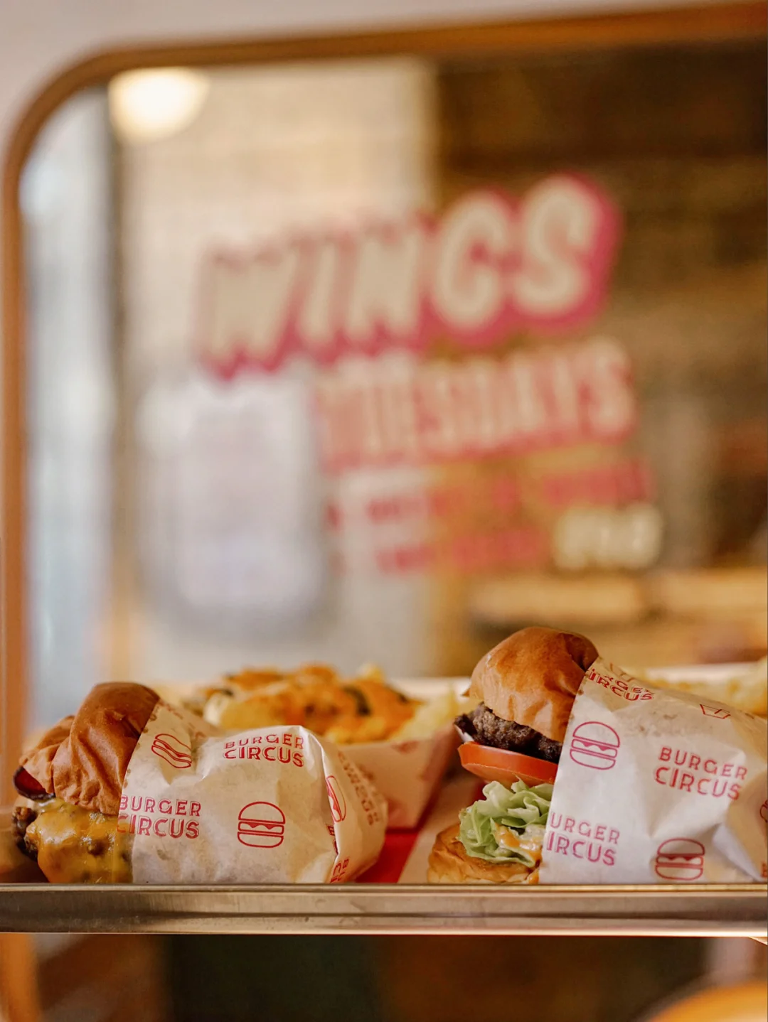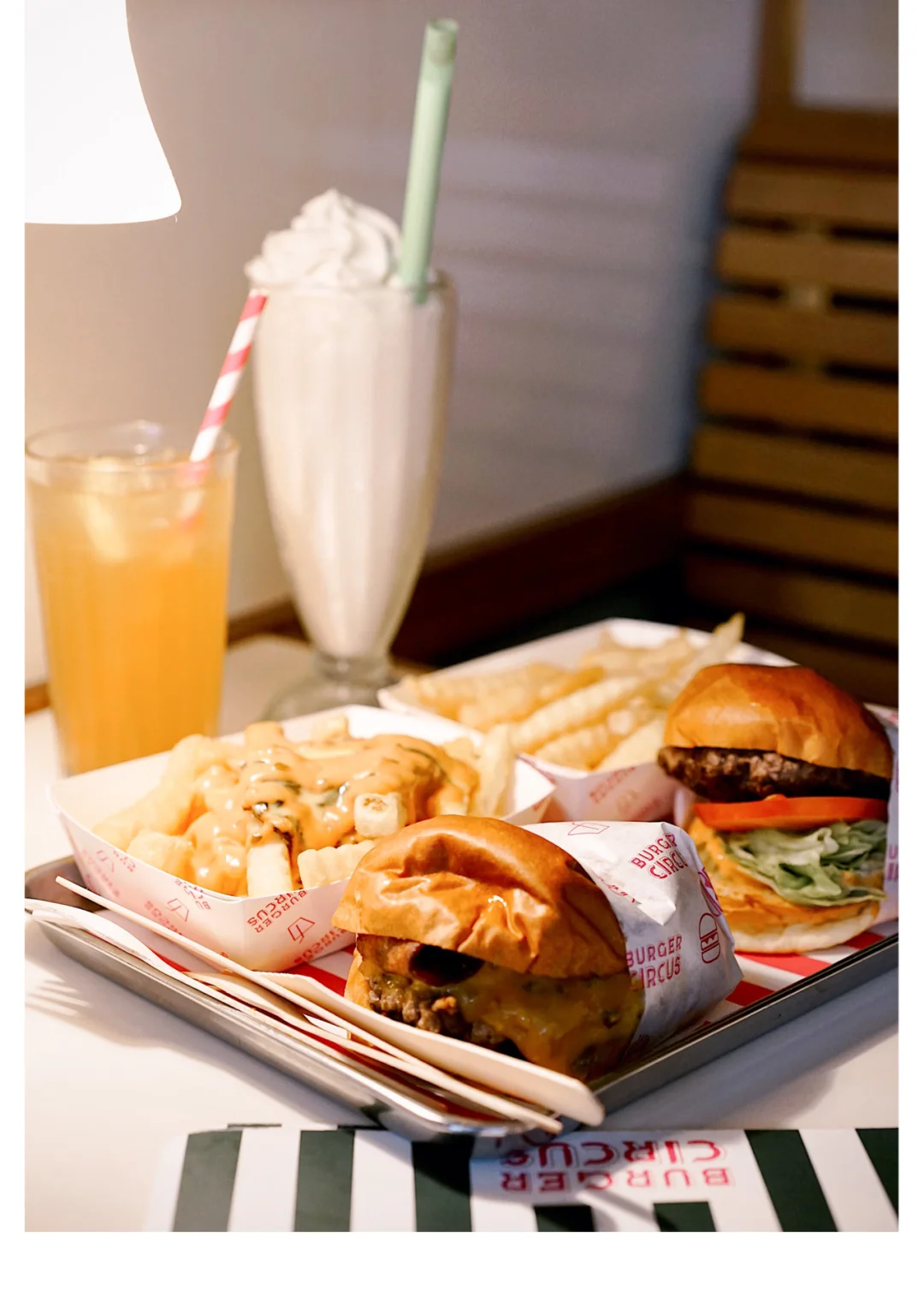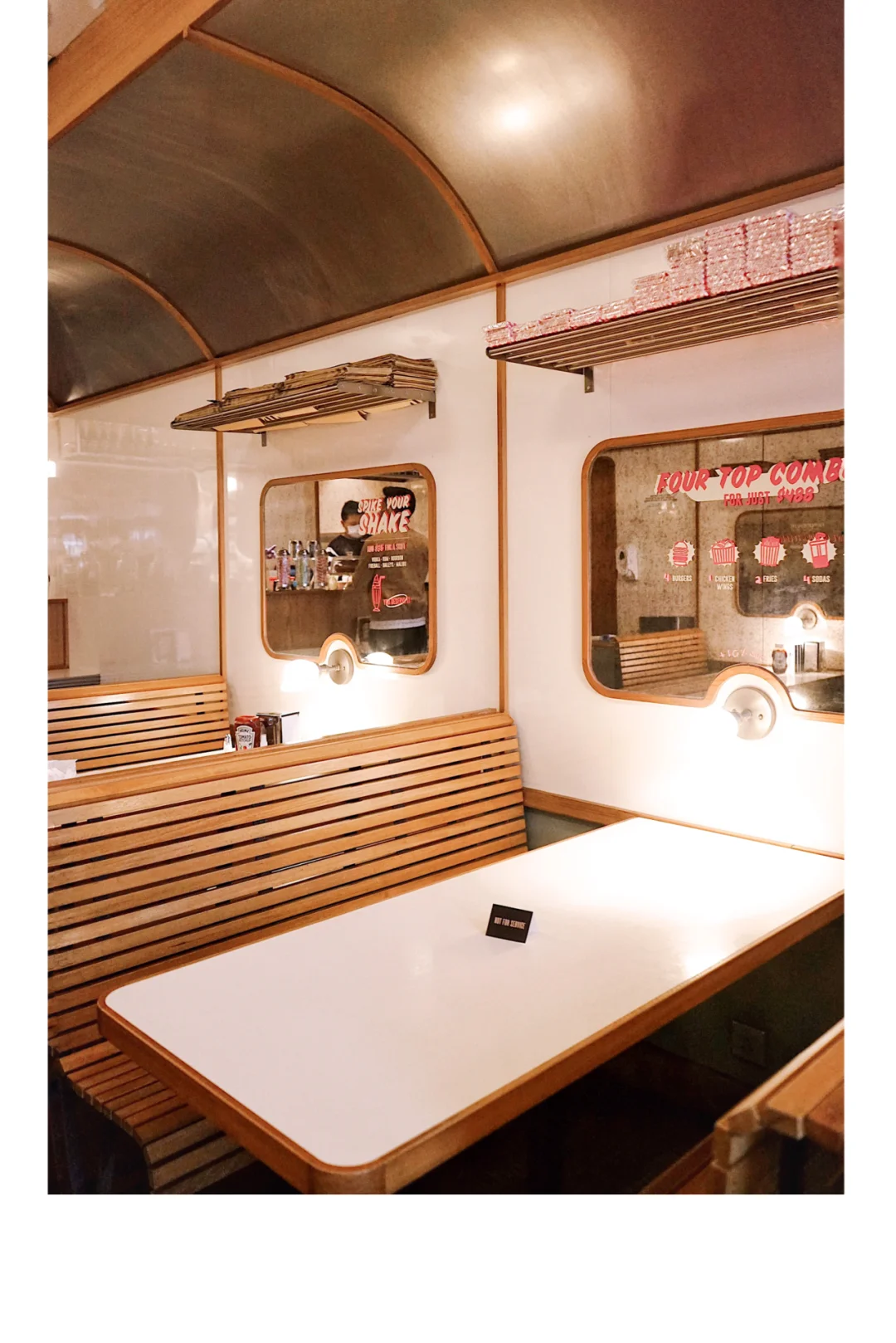 🎪Burger Circus的装潢仿似美国19世纪的餐车Diner设计,圆拱形的内侧,木条的卡座加上大玻璃窗的镜子,复古的玩味文字,仿佛在一列复古的车厢里。可爱的店员们带着bow tie,围裙上则是粉色的“Burger Circus”, 很像美国的Soda Jerk(水吧员)一样。可爱的店员看我在拍照,过来打趣说:camera first, our candy fits your dress.” 哈哈哈,的确,吧台上糖果罐里的糖果和我的裙子条纹一模一样。